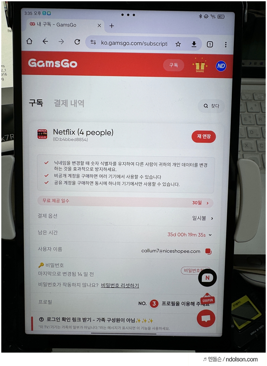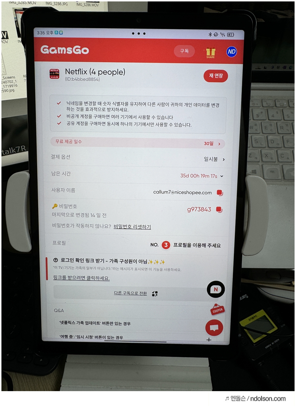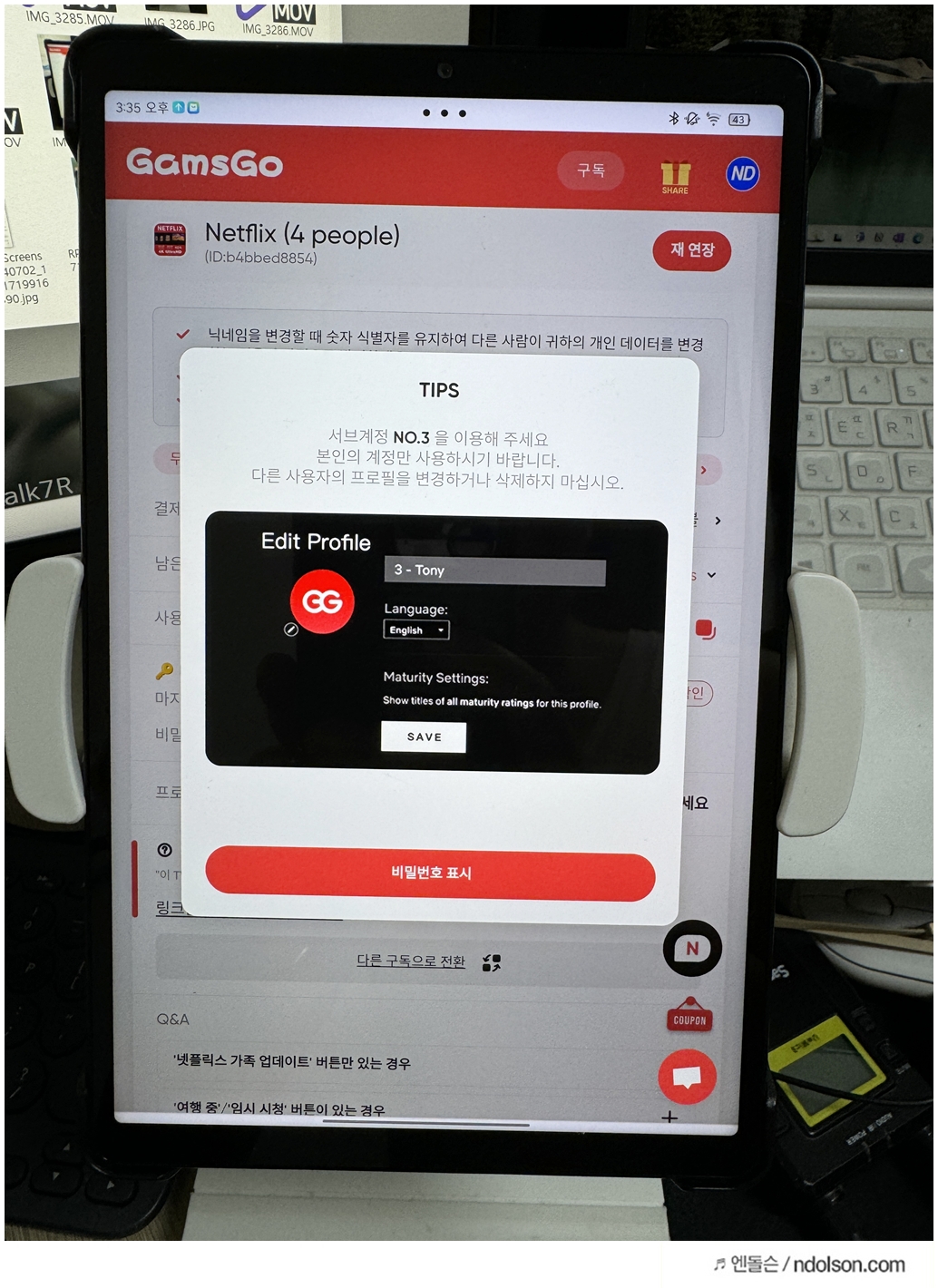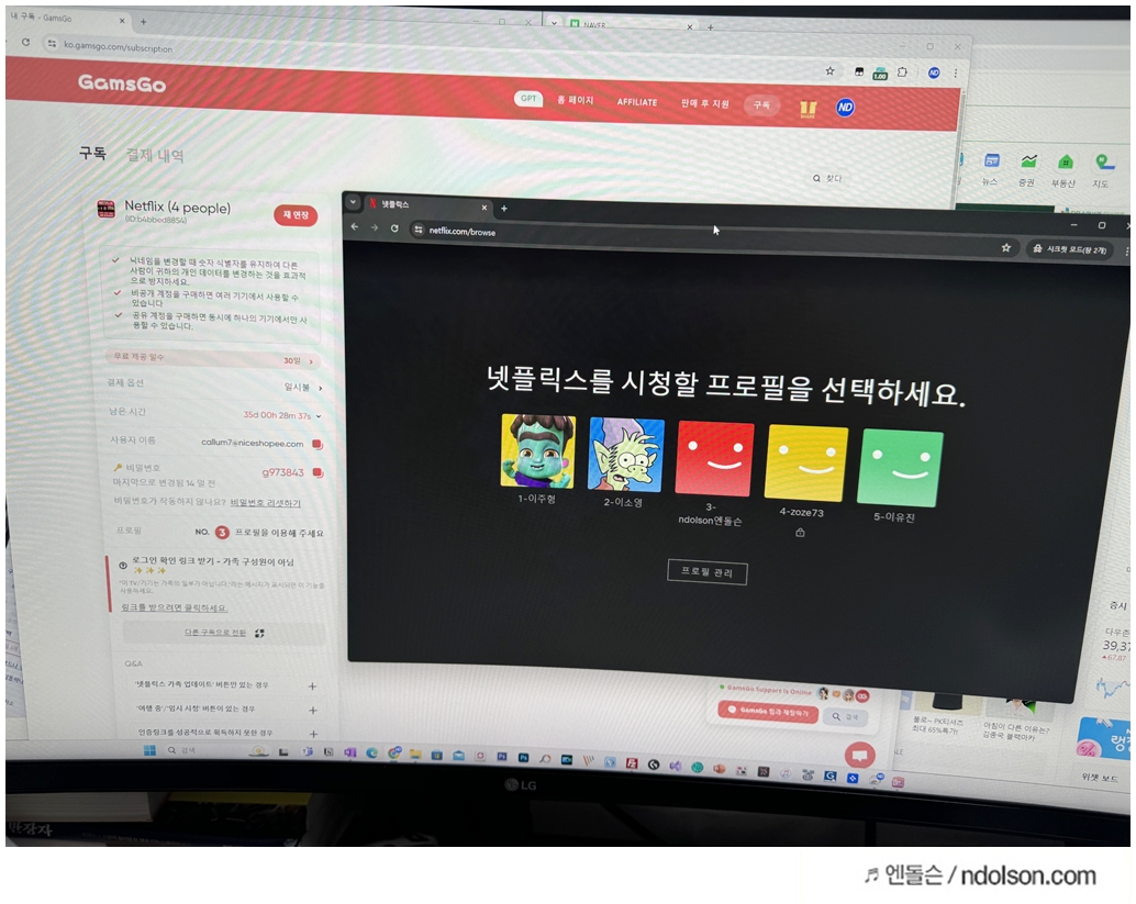 비밀번호 보기를 하면, 겜스고에서 제공해주는 넷플릭스의 공유 계정의 아이디, 패스워드가 나옵니다.