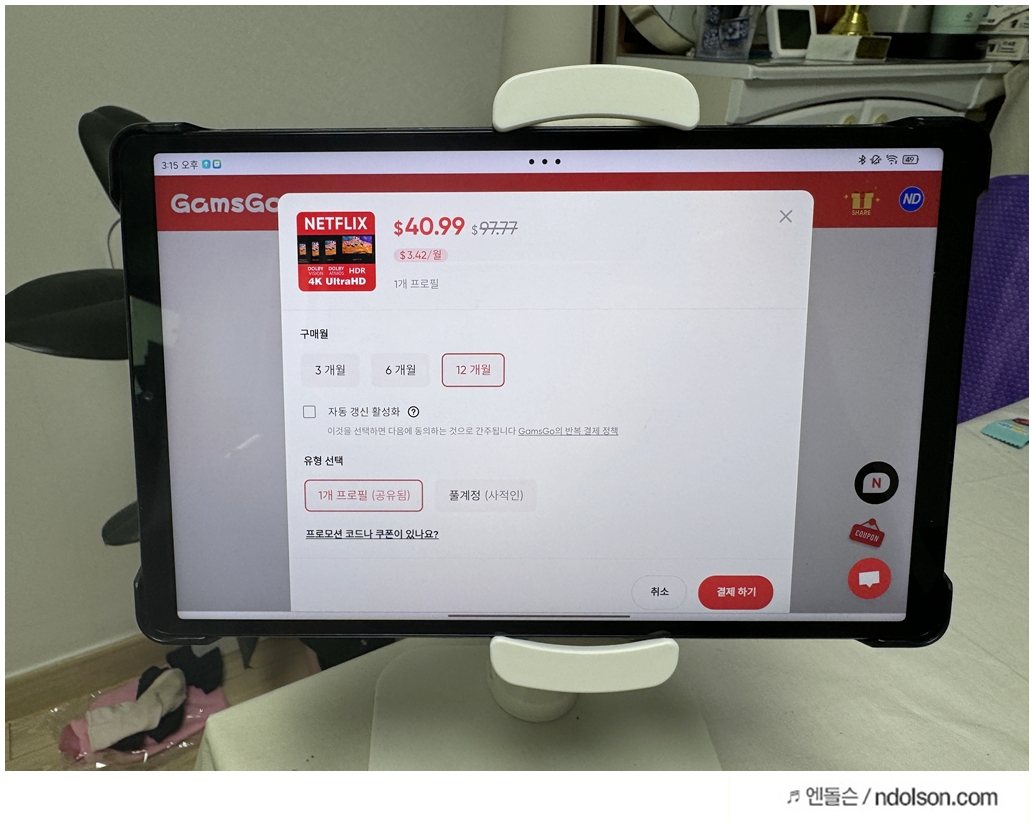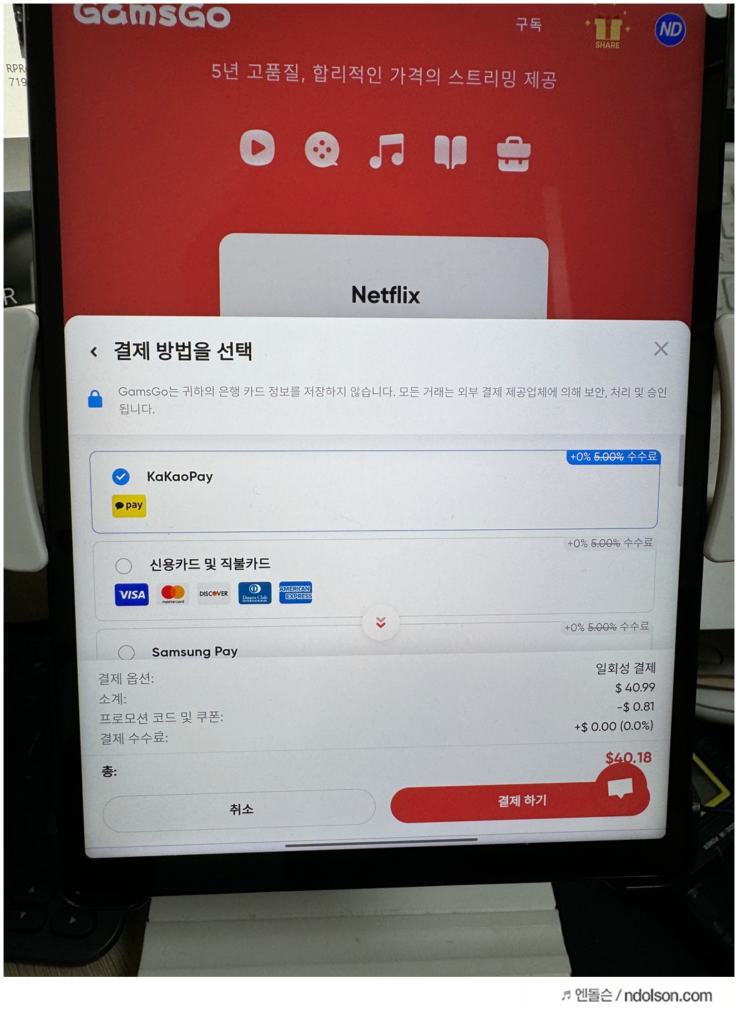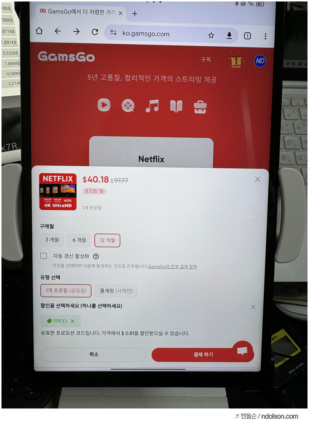넷플릭스 겜스고 서비스이 프로모션 코드를 넣으면, 할인을 더 추가로 받을 수도 있습니다. 0.81 달러 추가로 받았습니다.