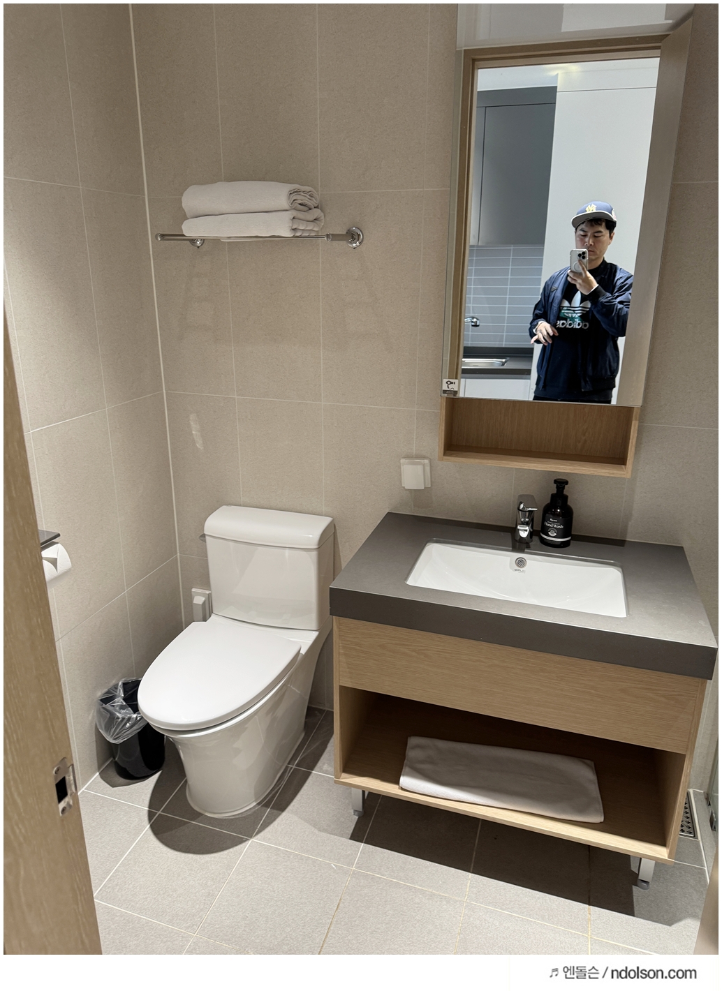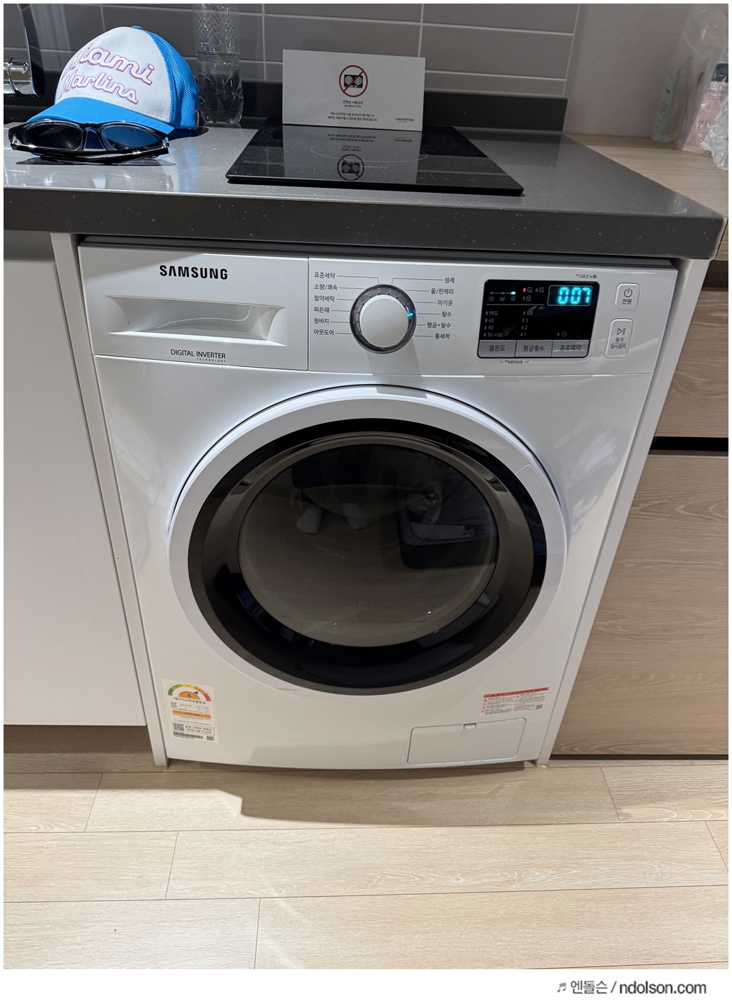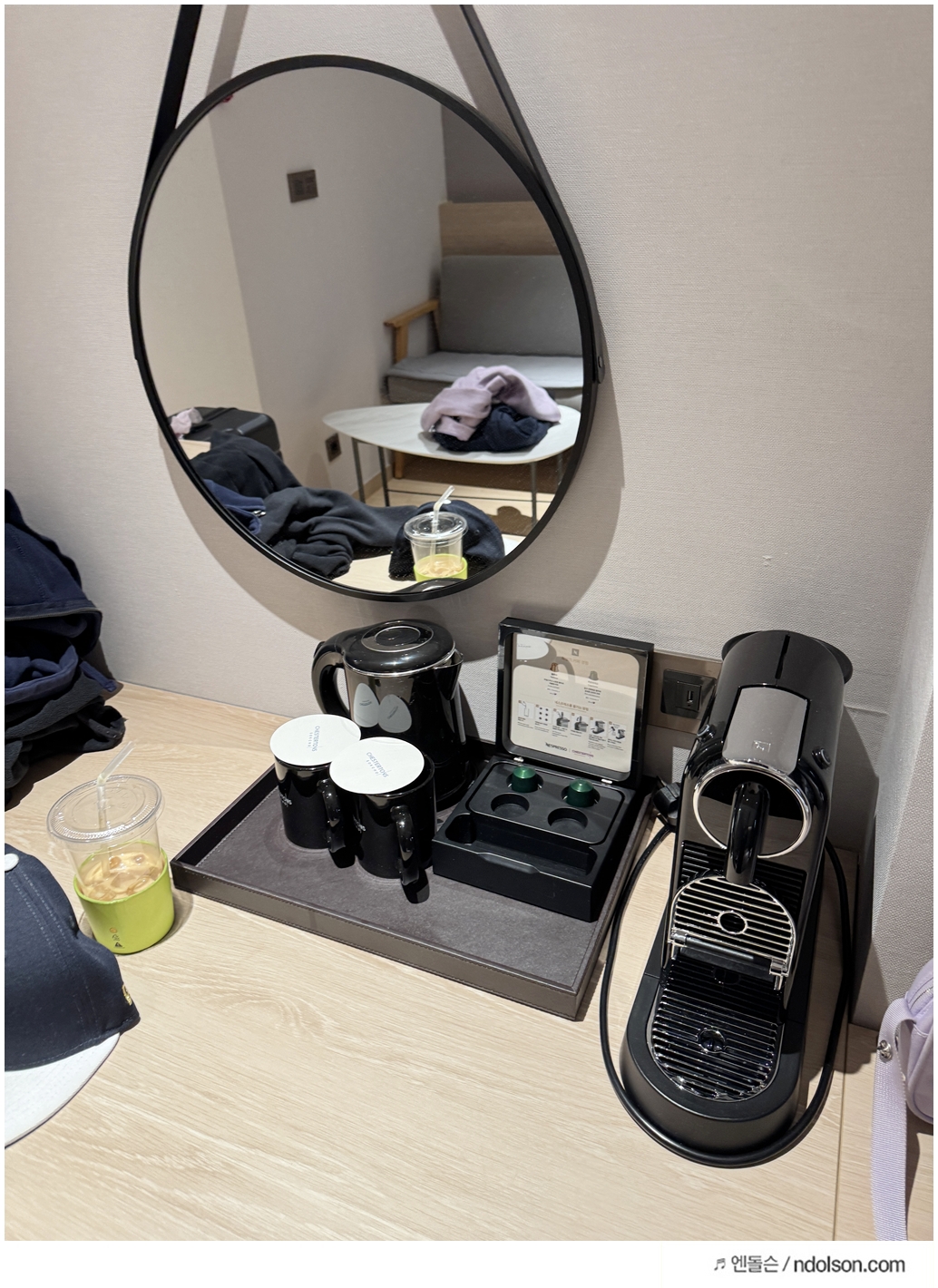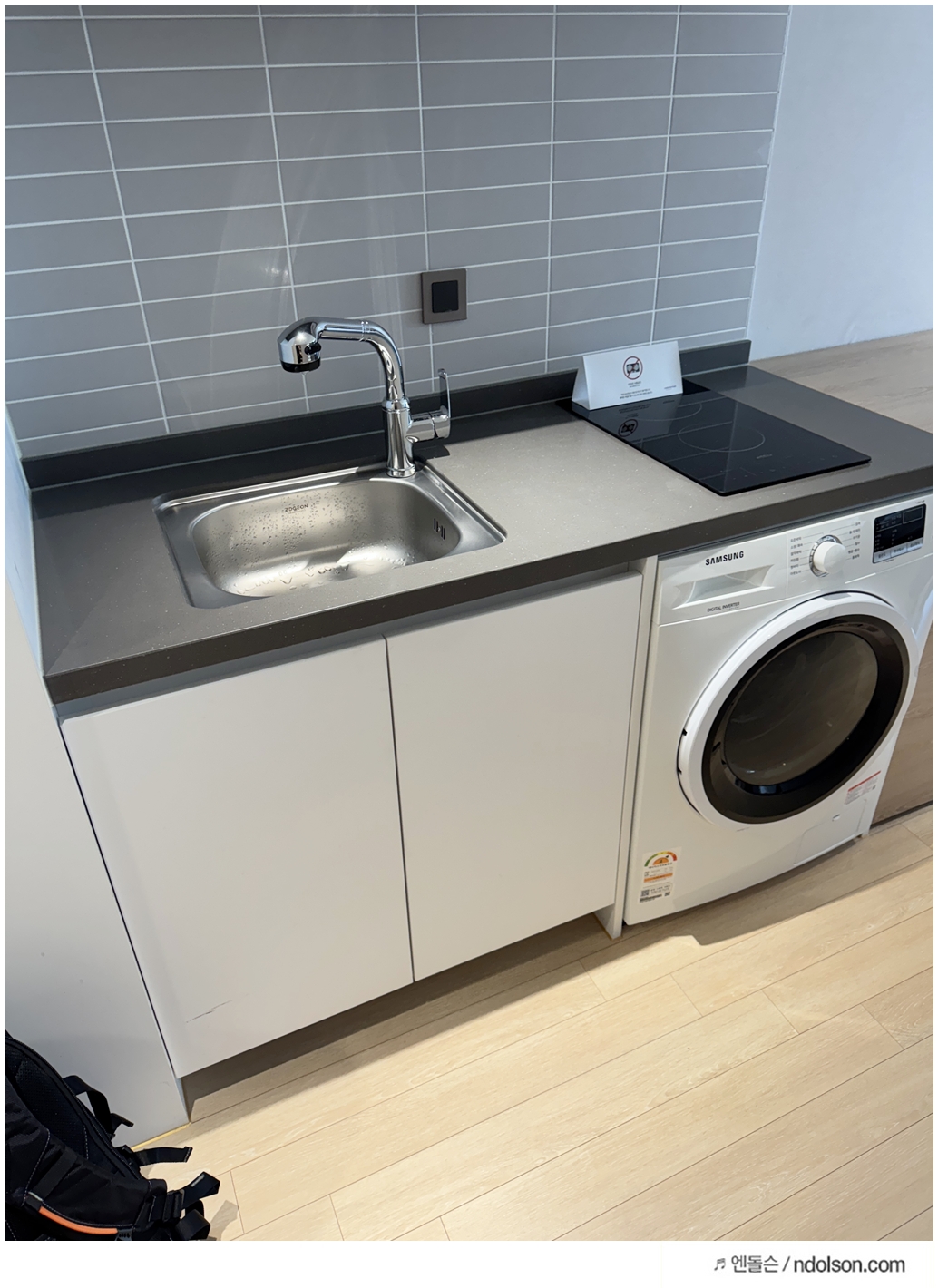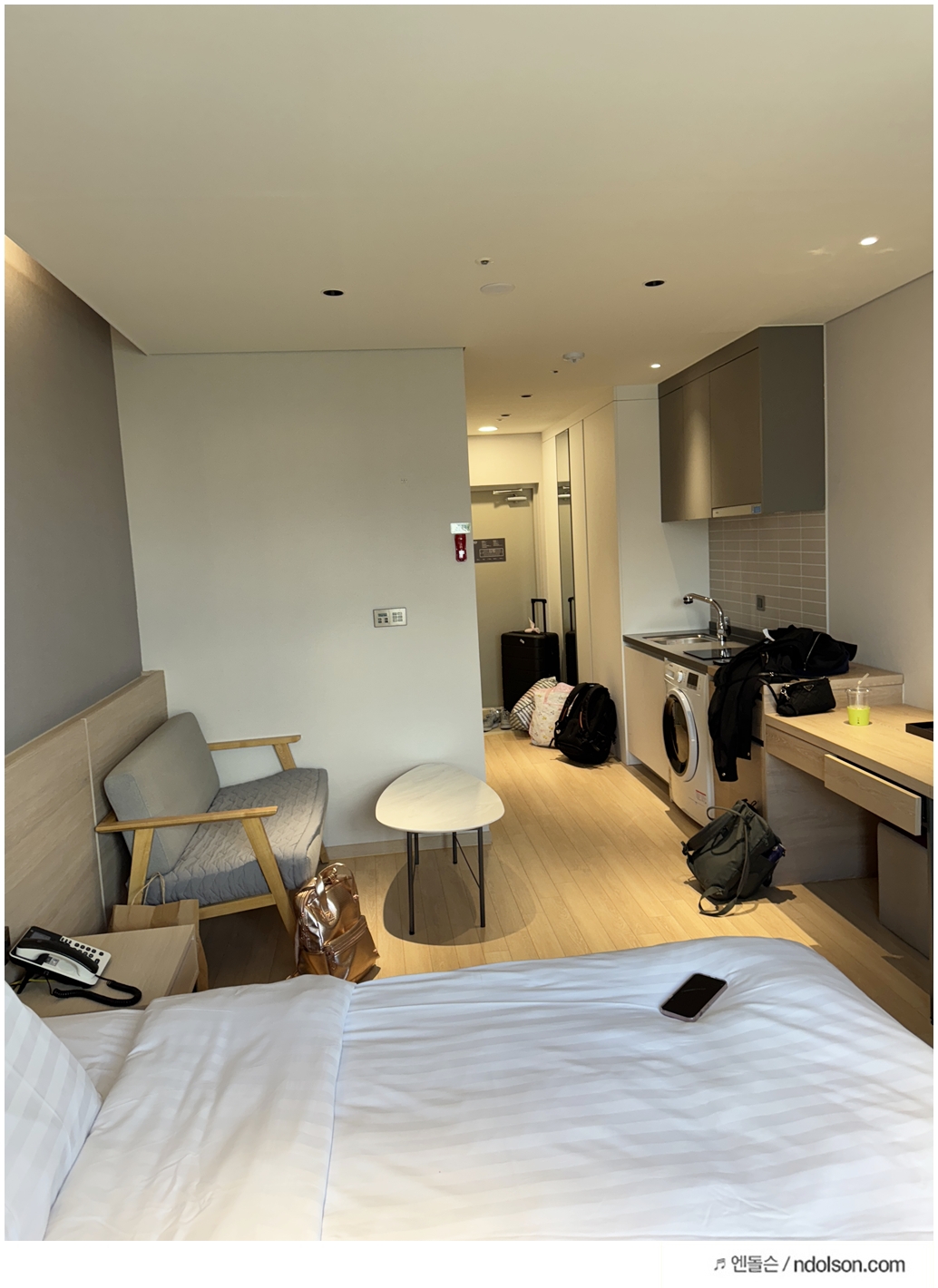 체스터톤스 객실 내부는 작은 오피스텔 같은 느낌입니다. 인덕션, 전자레인지, 커피머신, 세탁기까지 갖춰져 있어 집처럼 지낼 수 있는 환경은 만족스러웠습니다. 특히 세탁기와 함께 세탁세제까지 준비되어 있는 점은 정말 좋았어요. 자전거 대회로 입었던 옷을 바로 세탁할 수 있어서 깔끔했습니다.