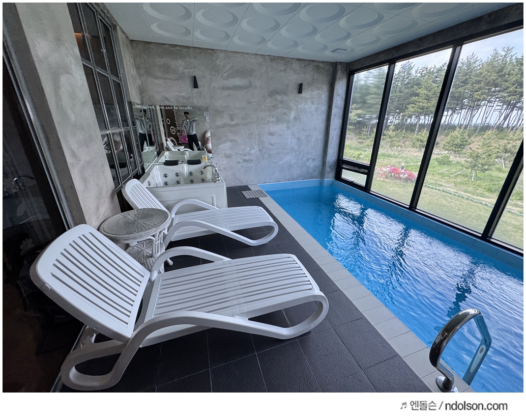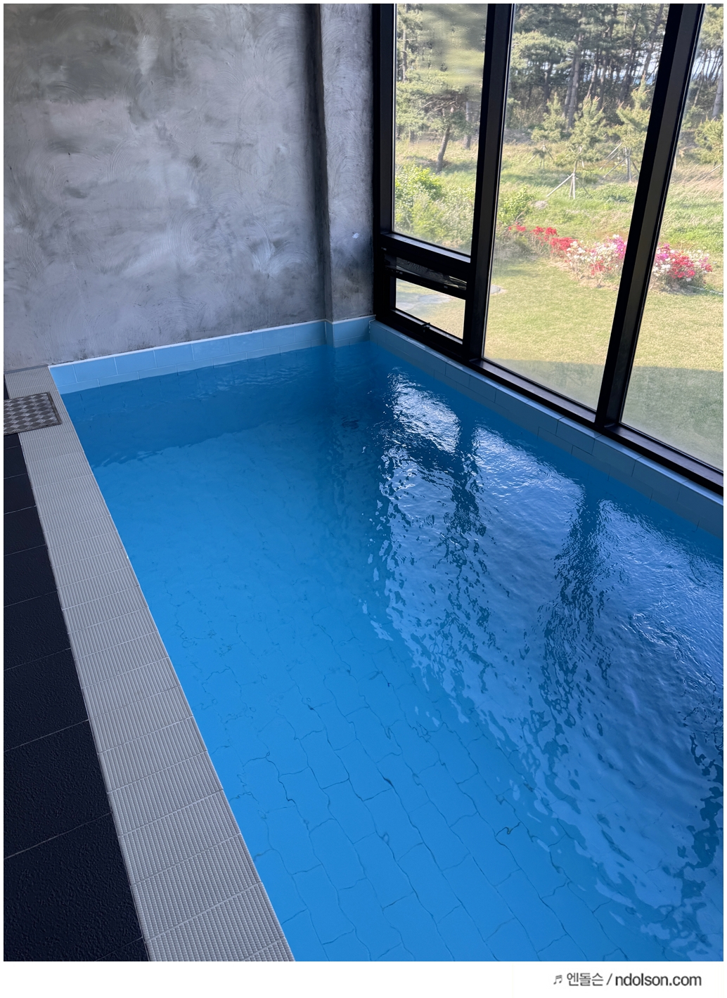 누볼라풀빌라의 가장 큰 장점은 바로 사계절 내내 즐길 수 있는 실내 온수 수영장입니다. 수영장은 객실 내에 설치되어 있어 프라이빗하게 즐길 수 있고, 크기도 상당히 넉넉합니다. (2.5m x 6m / 깊이 1.2m 기준) 깊이가 있어 어른들도 충분히 만족할 수 있고, 아이들과 함께 물놀이하기에도 안성맞춤입니다.