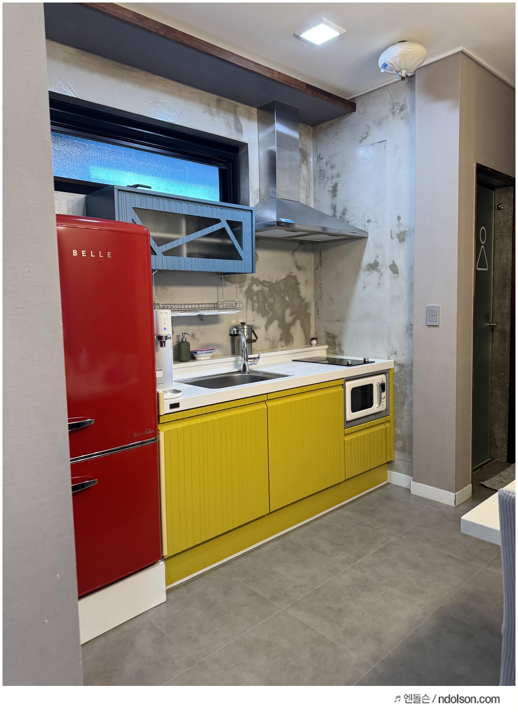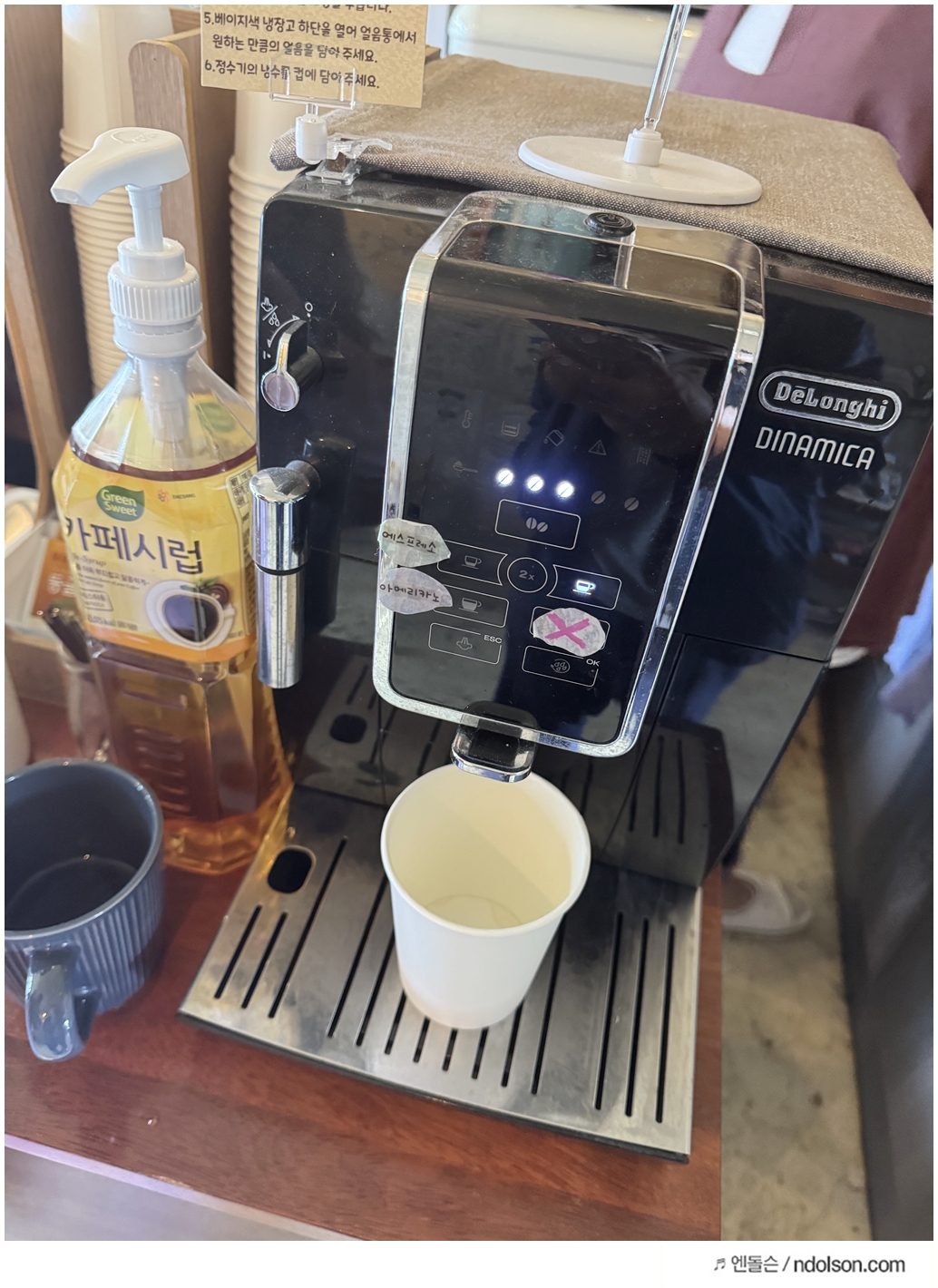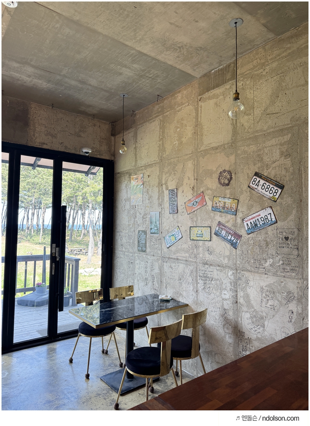 펜션 1층에는 예쁜 전용 카페 공간이 있으며, 투숙객은 무료로 커피를 즐길 수 있습니다. 아침에 커피 한잔 뽑아 바닷가 산책하는 여유는 정말 힐링 그 자체였어요. 커피 맛도 꽤 괜찮아 카페 부럽지 않았습니다.
