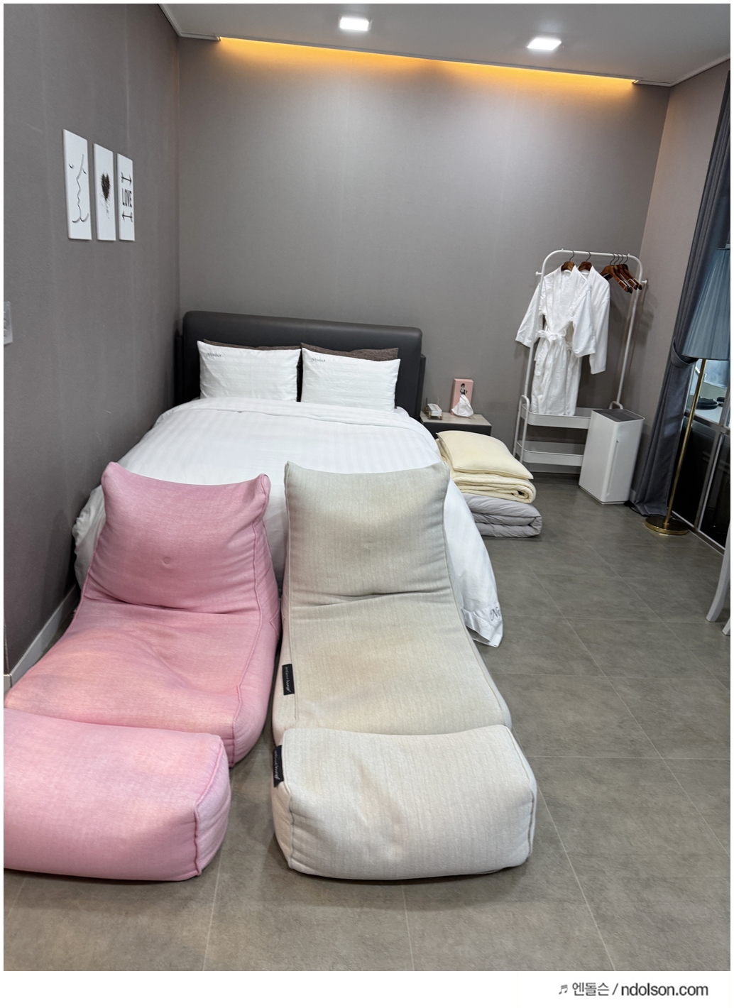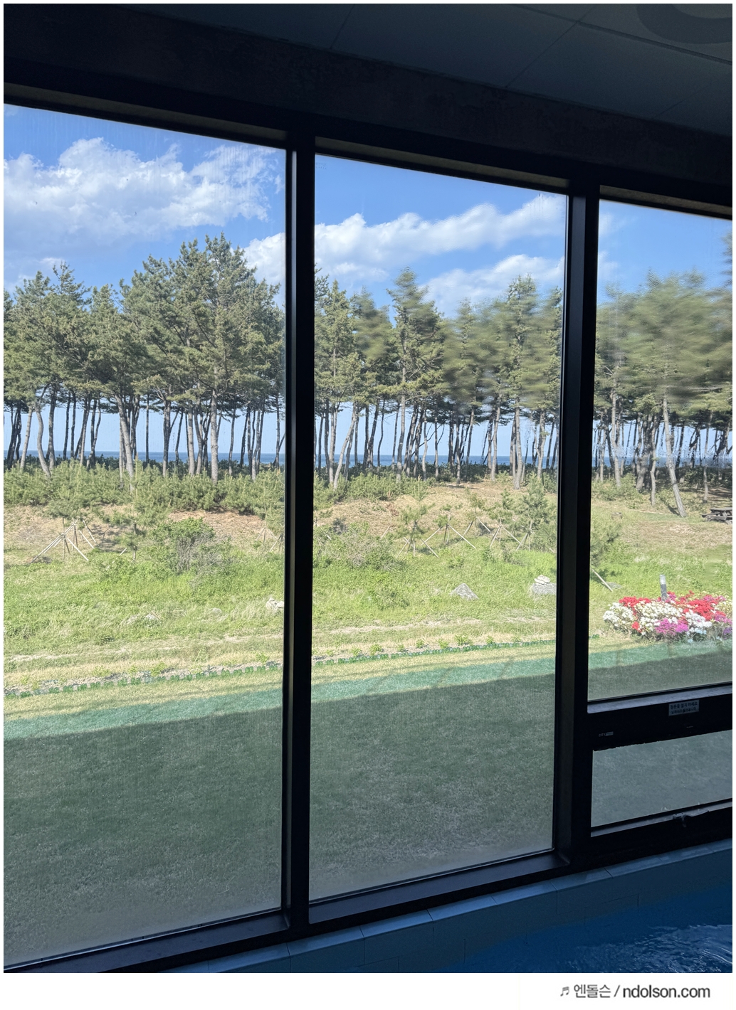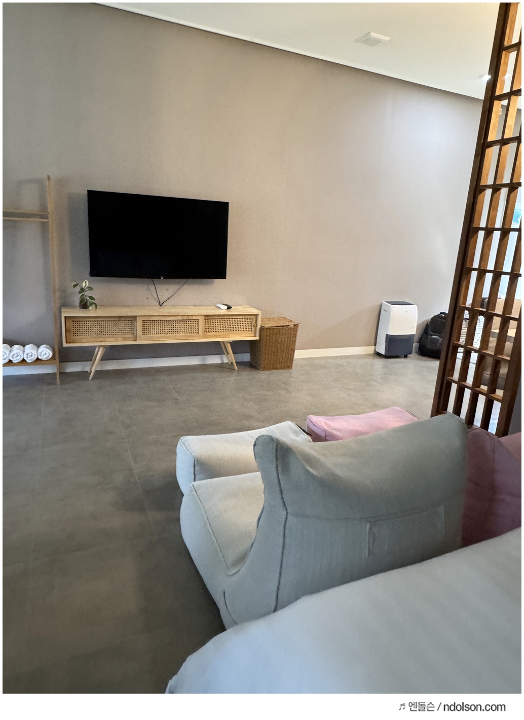 처음 방문했을 때부터 느꼈지만, 이곳은 인테리어가 정말 사랑스럽습니다. 전 객실이 깔끔하게 관리되어 있고, 작은 소품 하나까지도 정성스럽게 꾸며져 있어 호캉스 느낌의 힐링 공간을 선사합니다. 특히 이번에 묵은 치엘로 객실은 바다를 바라볼 수 있는 큰 창과 소나무 뷰가 일품이었습니다.