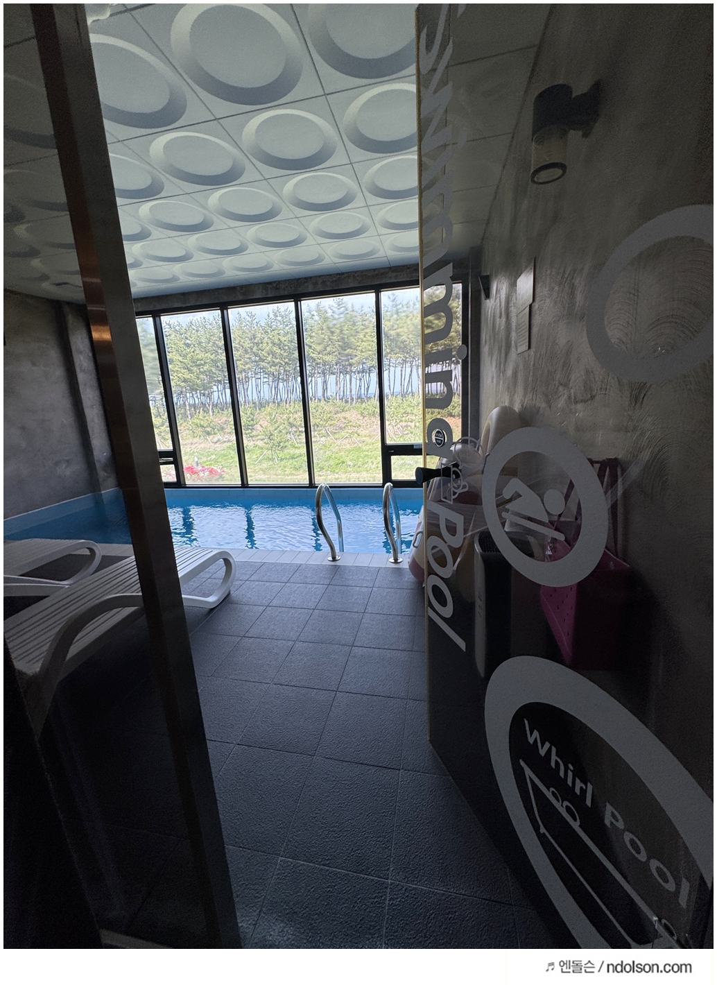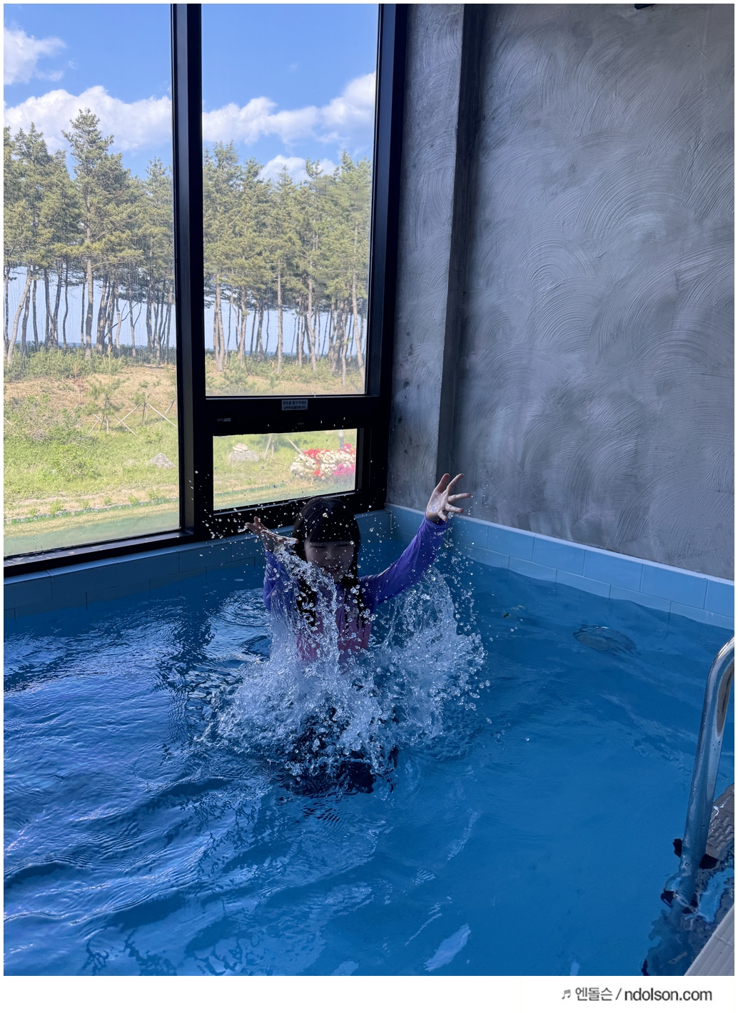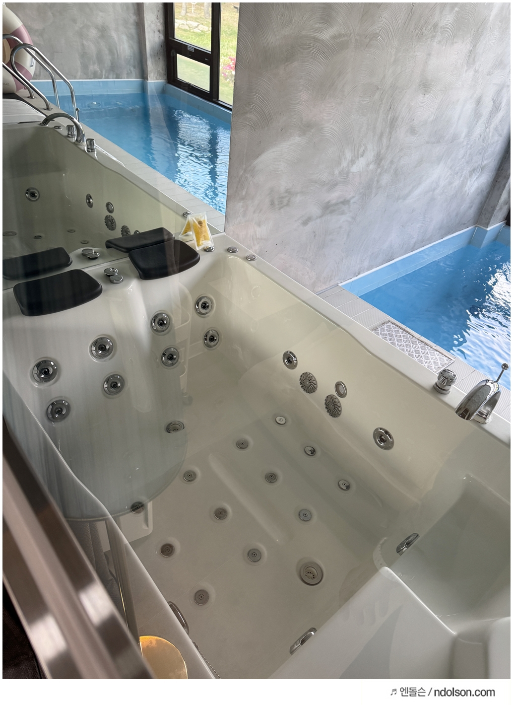 또 물의 온도는 기본적으로 따뜻하지만, 겨울철에는 온수 추가 옵션(70,000원)도 선택 가능합니다. 특히 아이가 있는 가정이라면 33도 정도로 맞춰주는 것이 훨씬 쾌적합니다. 수영 후엔 바로 옆 스파 시설로 이동해 따뜻하게 몸을 녹일 수 있어요. 스파 전용 소금도 제공되는데, 녹이며 즐기는 재미도 있습니다.