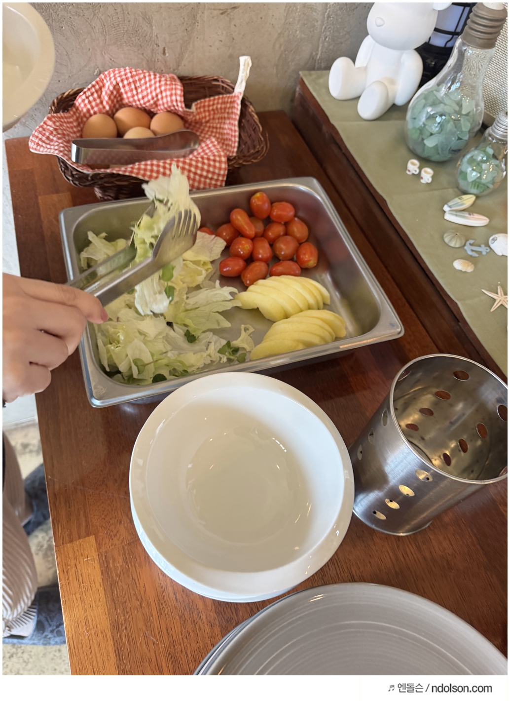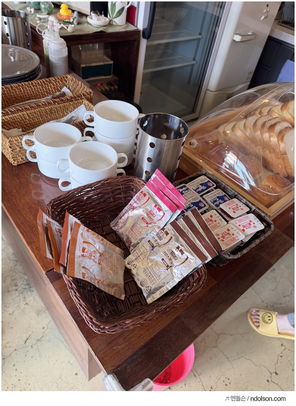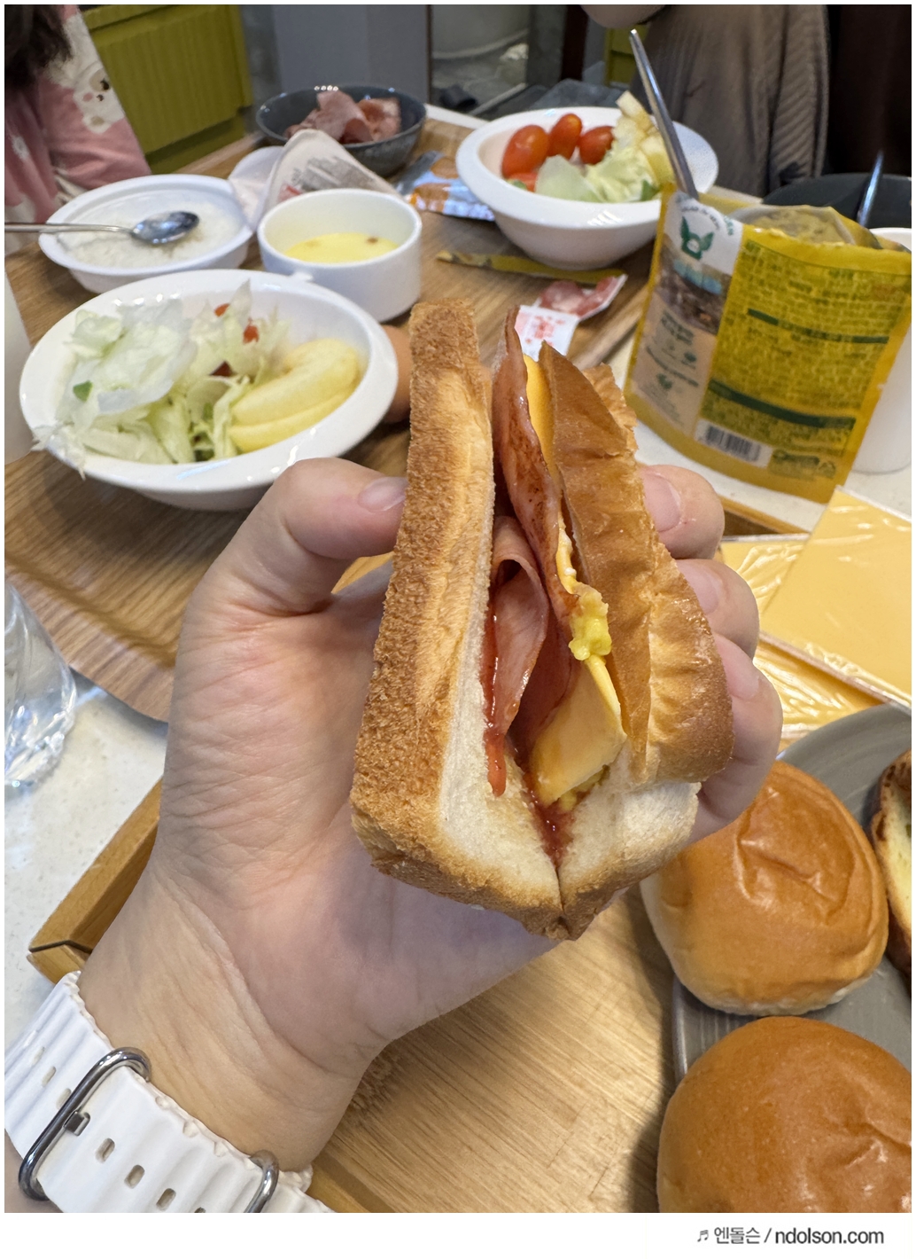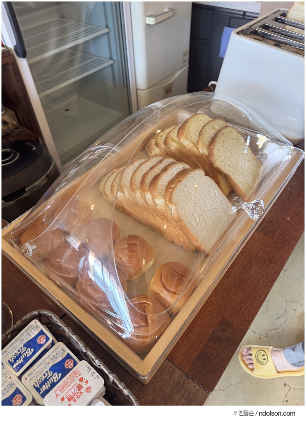 아침에는 간단하지만 든든한 조식 서비스가 제공됩니다. 식빵, 샐러드, 계란, 스프, 커피 등으로 구성되어 아침 식사를 따로 준비하지 않아도 되어 참 편리합니다. 집에서 들고온 햄이랑 호박 샐러드 발라 먹으니 더 맛있어요.