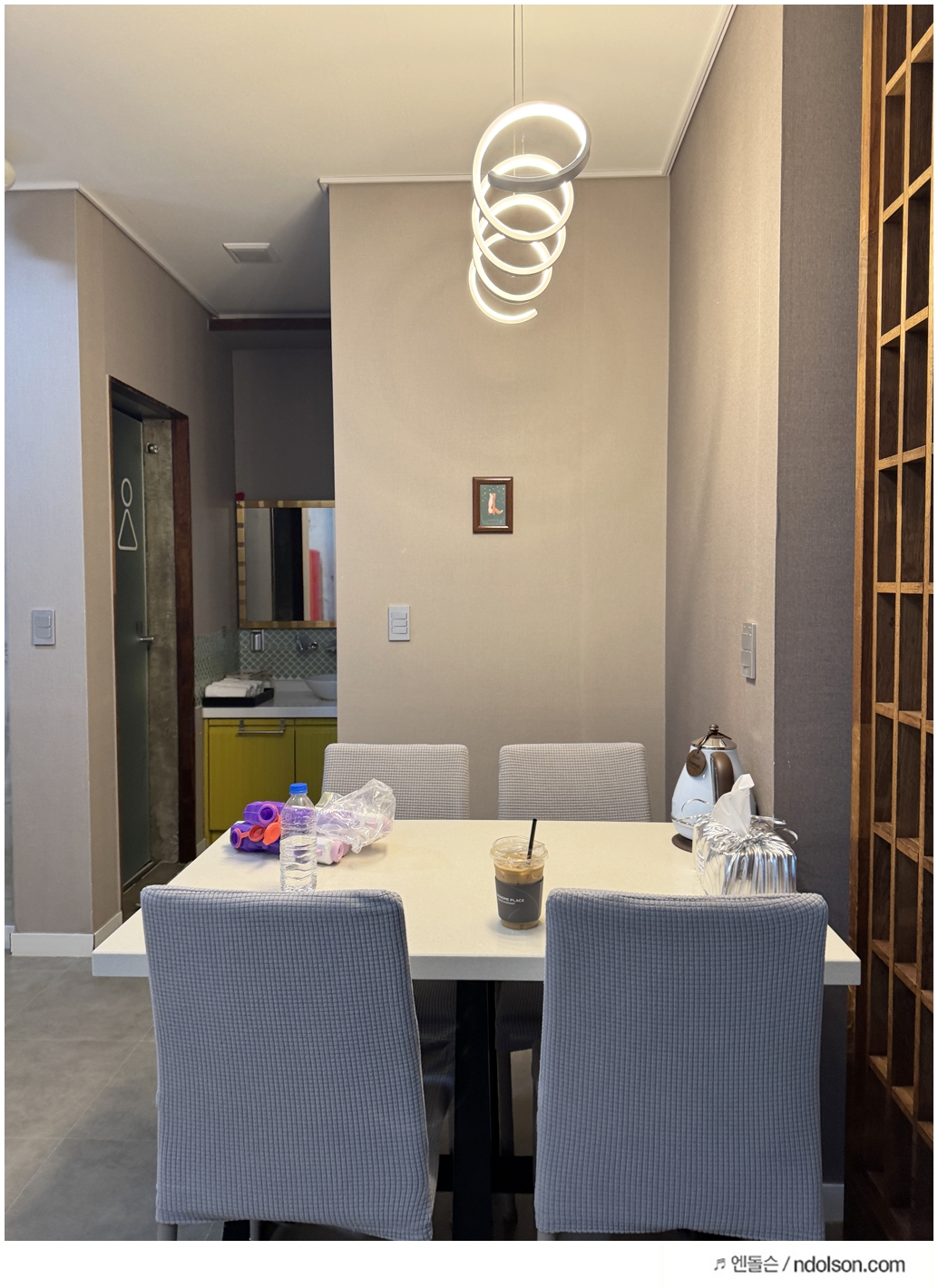 실내에는 기본적인 생활 가전이 모두 갖춰져 있습니다. 전자레인지, 정수기, 커피포트, 에어컨, 보일러까지 모두 완비되어 있어 장기 숙박도 무리 없습니다. 무엇보다 화장실이 샤워실과 변기 공간이 분리되어 있어 사용하기 편리했습니다.