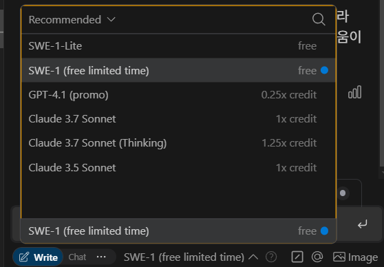 - SWE-1: 약 Claude 3.5 Sonnet 모델에 버금가는 탁월한 도구 호출 및 추론 능력을 갖추었으면서도, 운영 비용은 현저히 낮춘 플래그십 모델입니다. 출시 기념 프로모션 기간 동안 모든 유료 사용자에게 사용자 프롬프트당 0 크레딧이라는 파격적인 조건으로 제공됩니다.