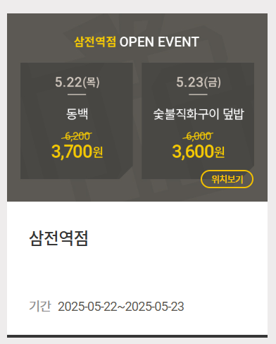 5월 23일(금): 숯불직화구이 덮밥을 정상가 6,000원에서 3,600원에 만나볼 수 있습니다.
