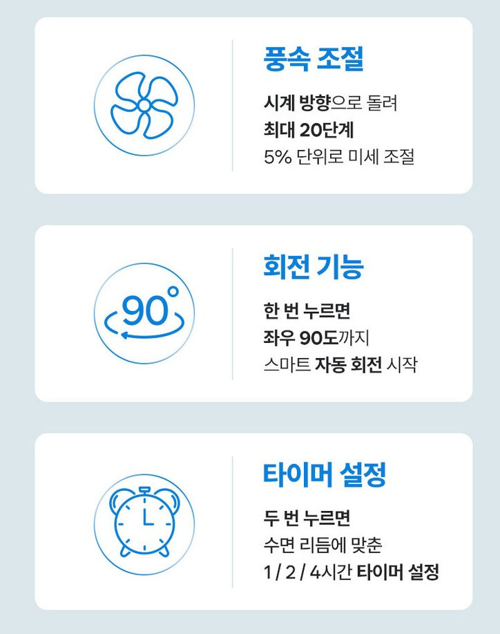 바람 세기도 강력해서 작은 사이즈에도 불구하고 책상 위를 시원하게 유지할 수 있었고, 특히 저소음 기능 덕분에 업무 중에도 선풍기의 소음에 신경 쓰지 않아도 되어 더욱 편안하게 사용할 수 있었습니다.