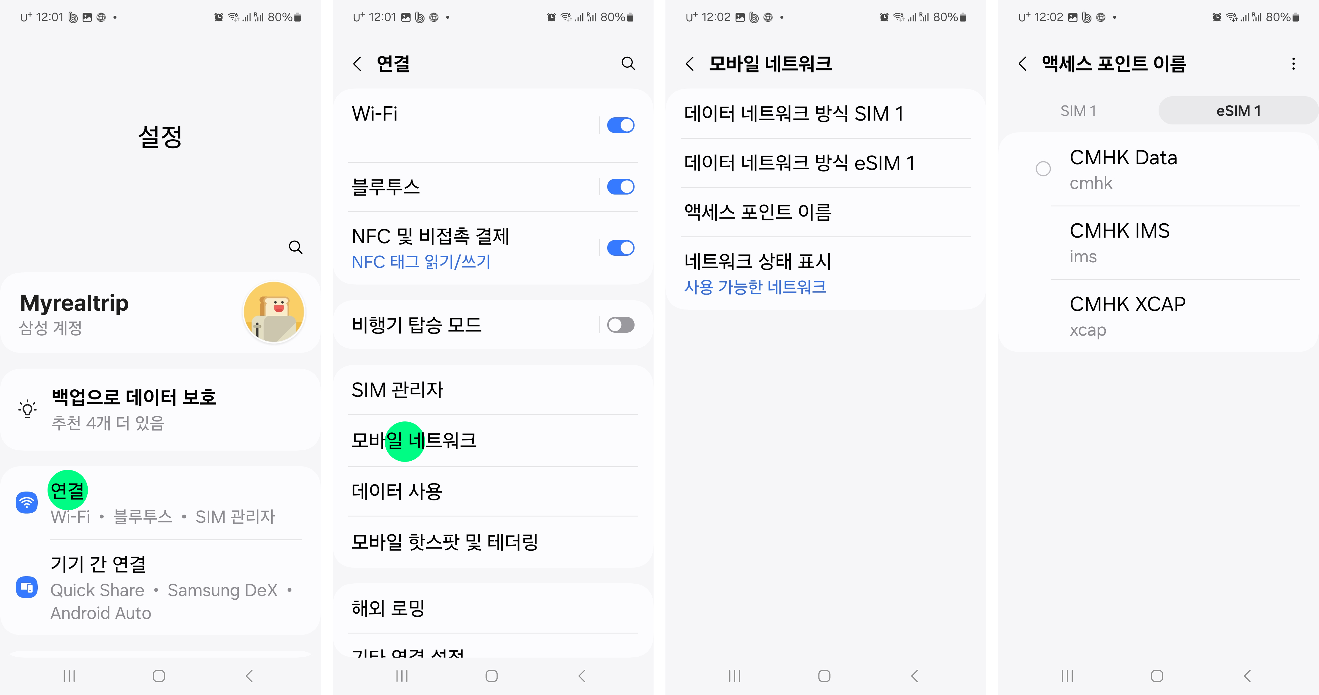 설정 > 연결 > SIM 관리자 > eSIM 1 ON