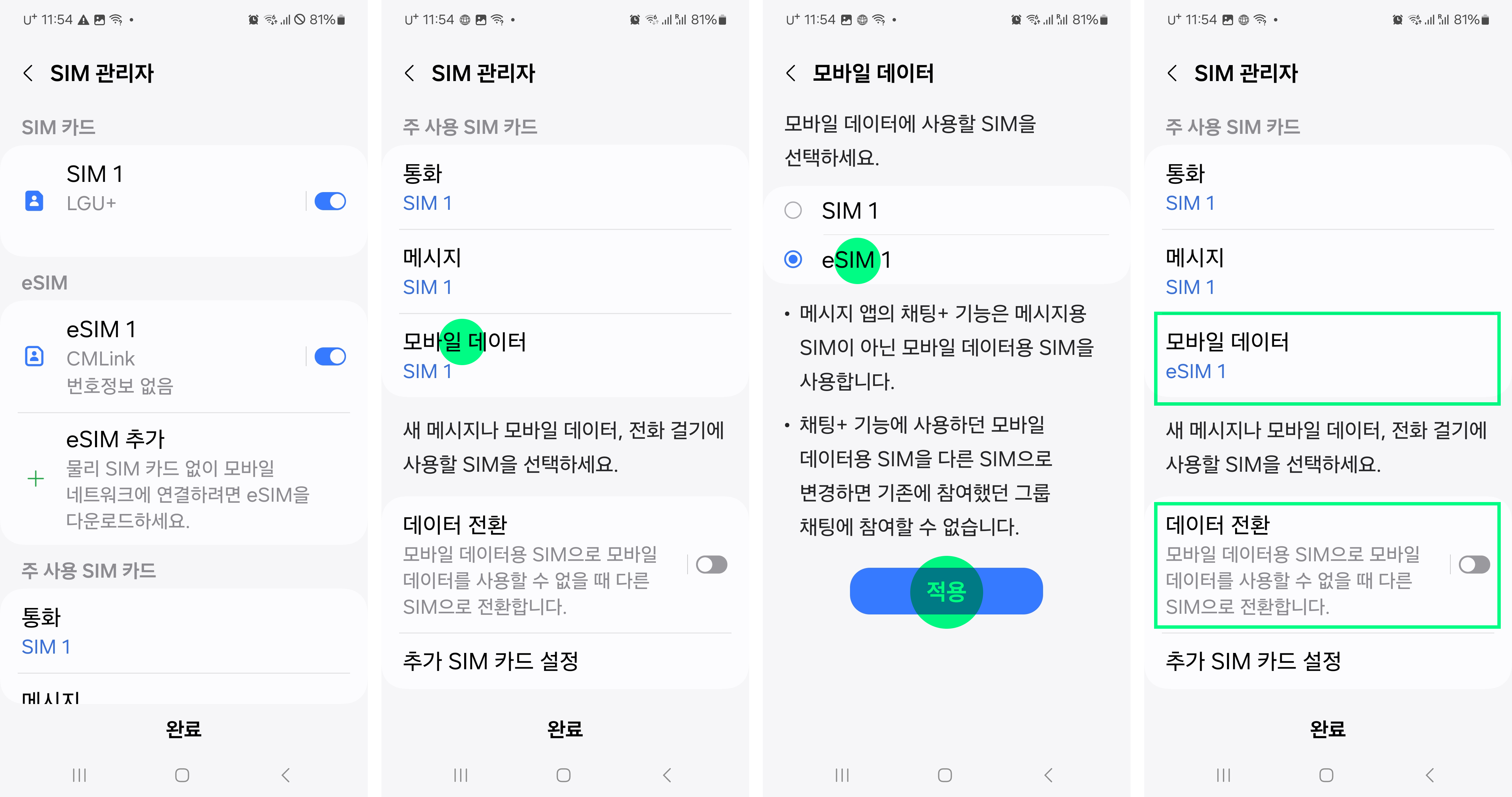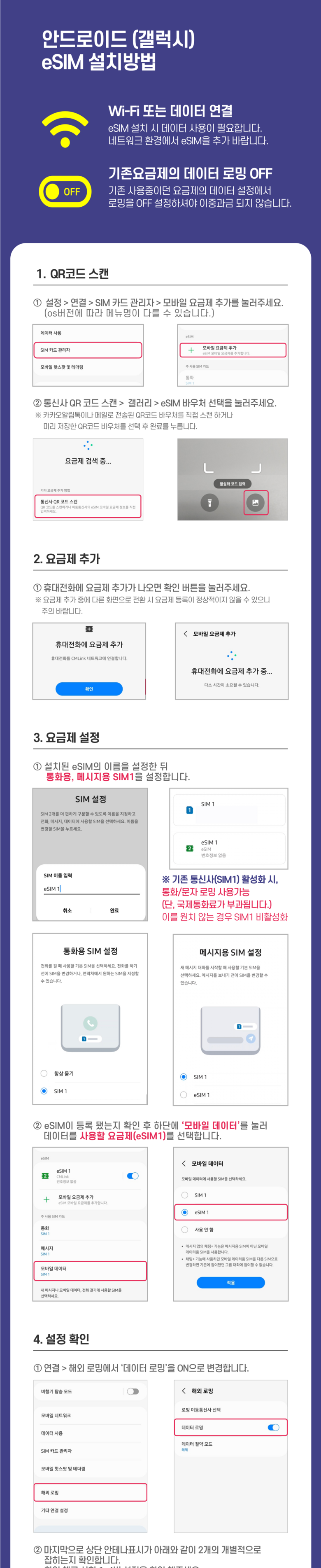 - 갤럭시는 설정 > 연결 > SIM 관리자 > eSIM 1 ON, ‘모바일 데이터 eSIM 1’로 설정되어 있는지, 데이터 전환 옵션이 꺼져 있는지 확인하세요.