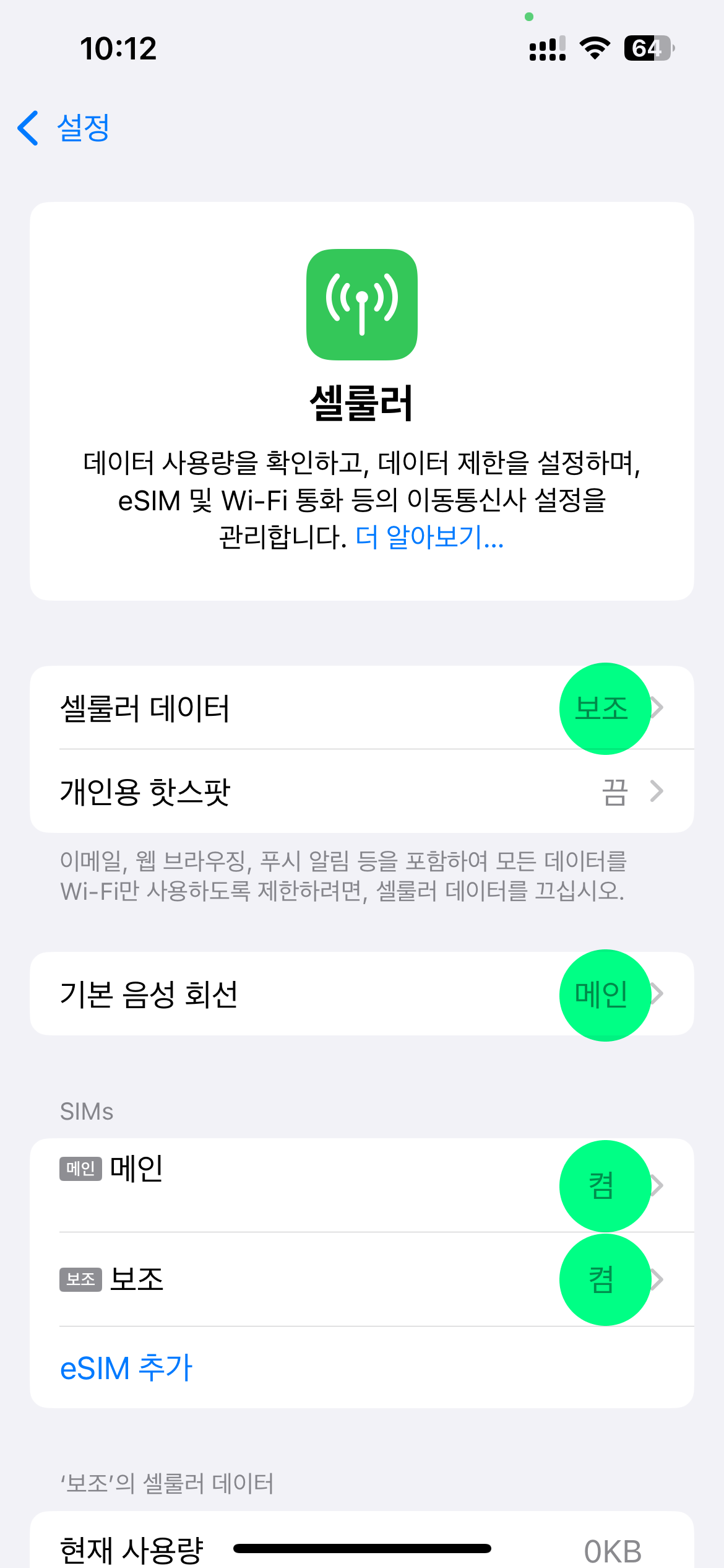 설정 > 셀룰러 > ‘설치된 요금제(보조)’ 항목 옆 스위치(ON)를 켭니다.
