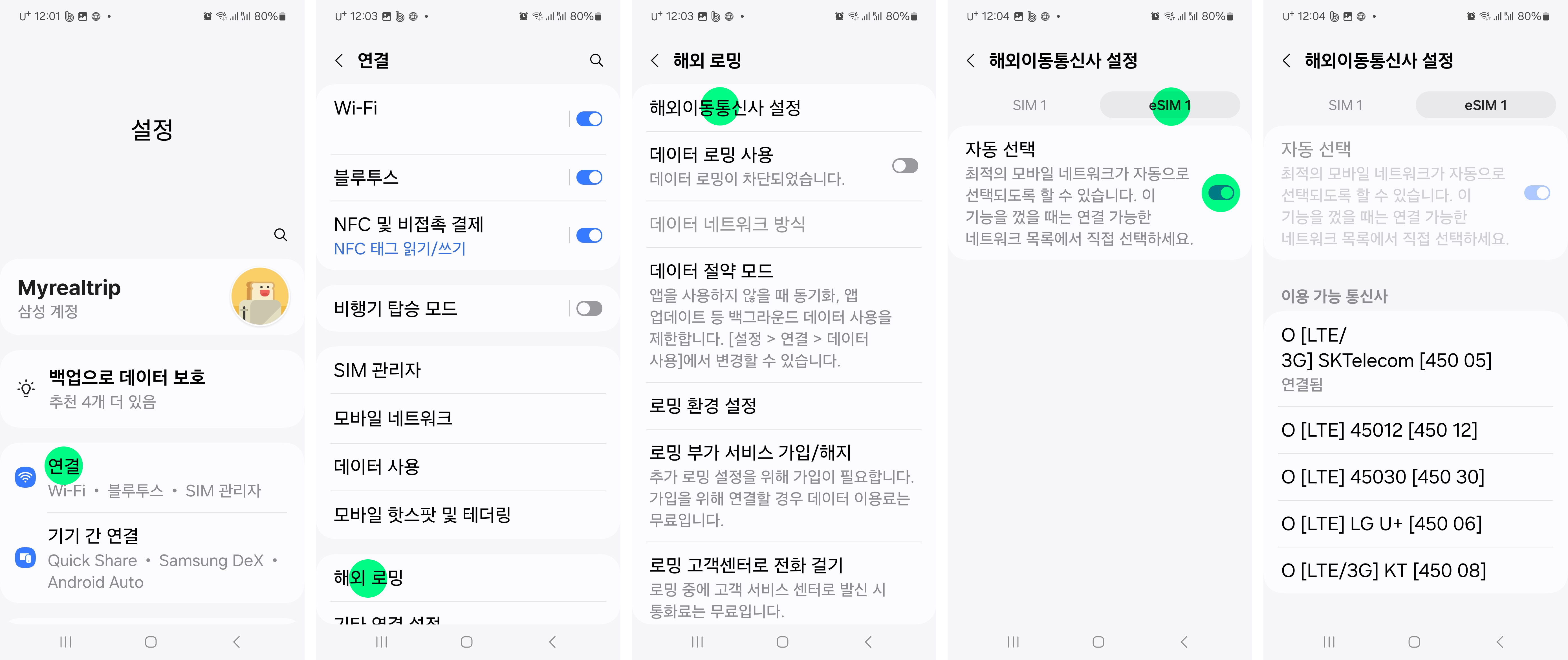 갤럭시 : 설정 > 연결 > 해외 로밍 > 해외이동통신사 설정 > eSIM 1 > 자동 선택 'OFF' > 이용 가능 통신사 중 설정