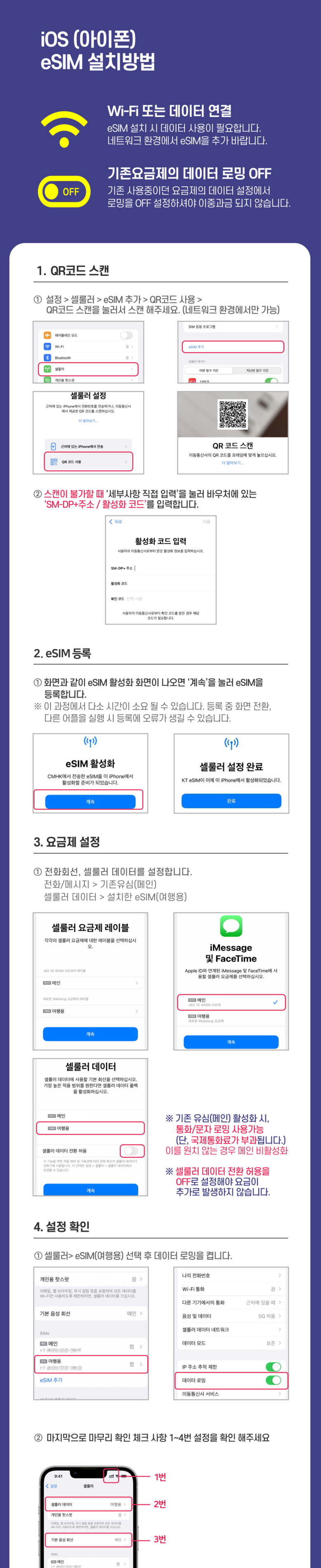 지원 기기 확인 → 2. 한국에서 QR코드로 프로필만 설치 → 3. 현지 도착 후 eSIM 활성화(데이터 로밍 켜기) → 4. 필요 시 문제 해결 이 네 단계만 기억하시면 어렵지 않게 eSIM을 사용할 수 있습니다. ^^