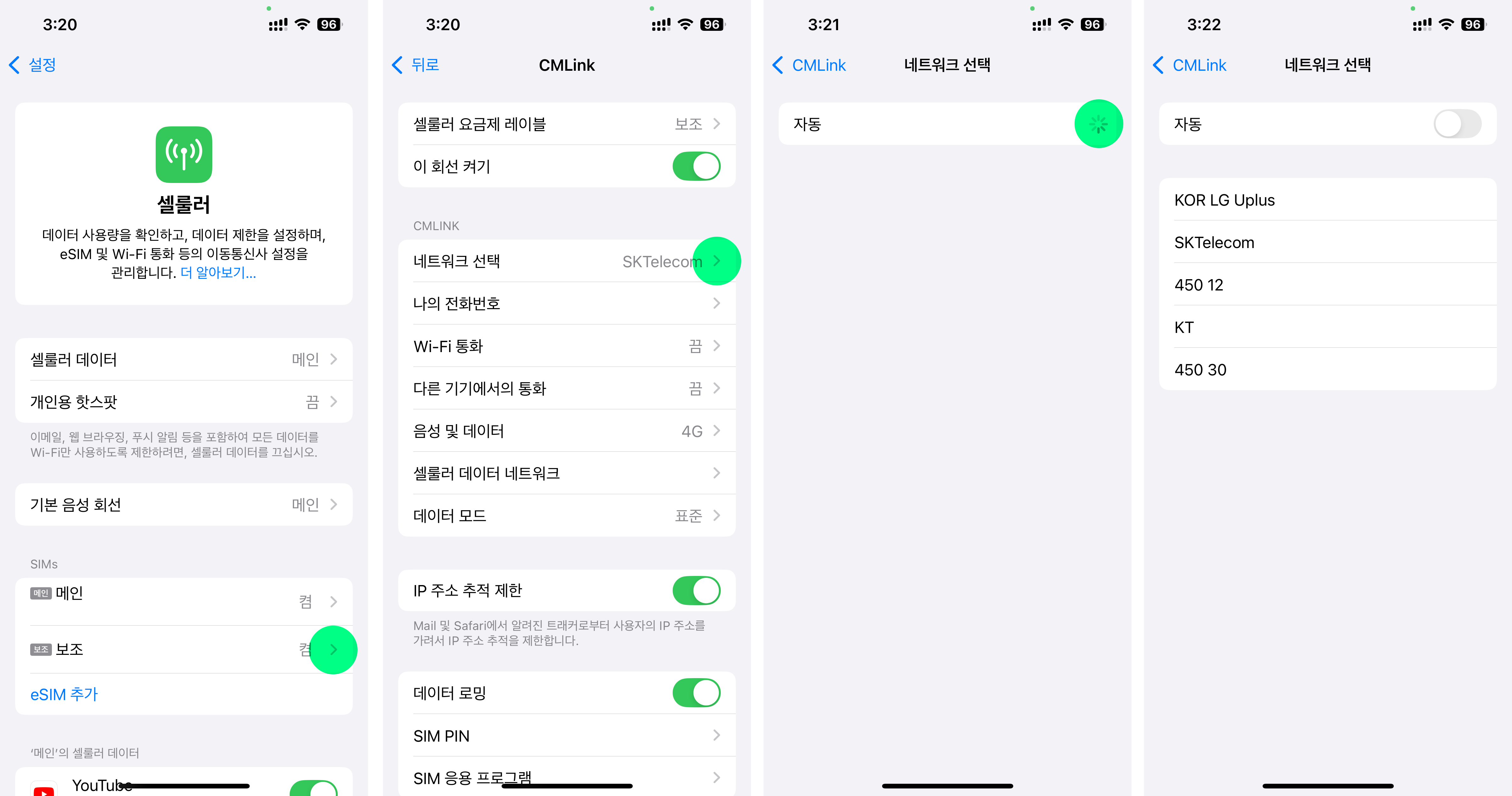 *아이폰 : 설정 > 셀룰러 > SIMs-보조 > 네트워크 선택 > 자동 OFF > 통신사 수동 선택 > 뒤로가기