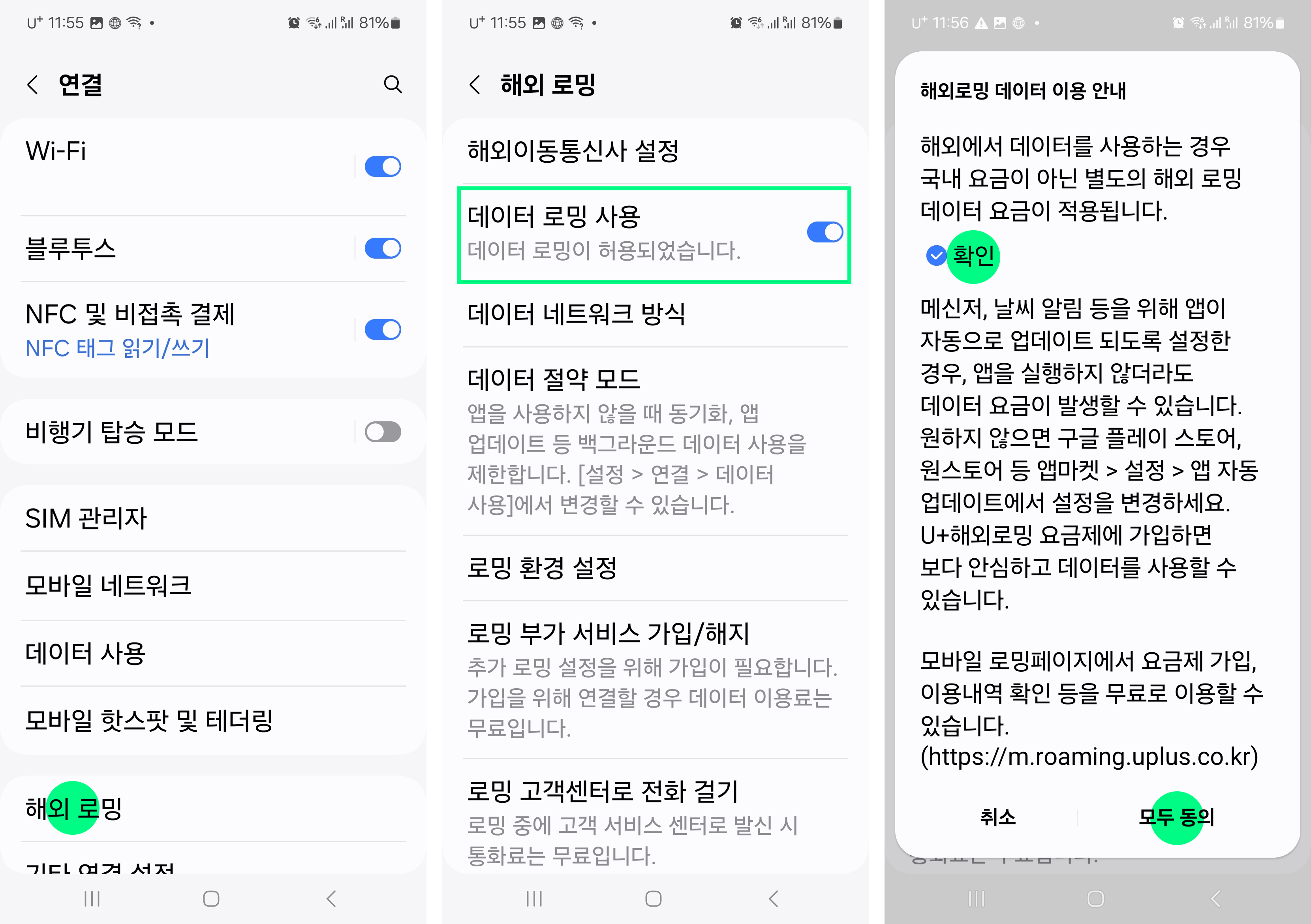설정 > 연결 > 해외 로밍 > 데이터 로밍 사용 ON