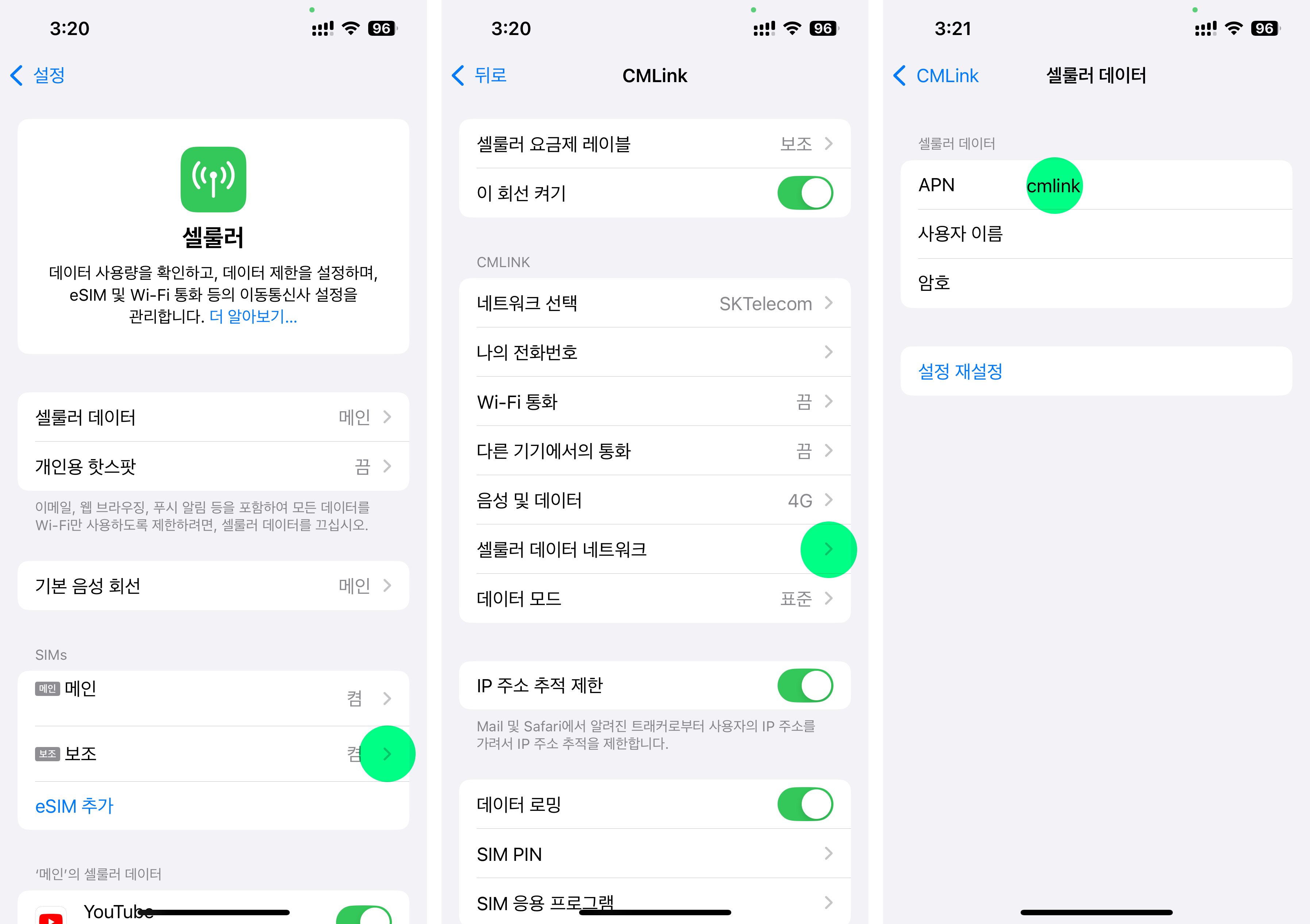 *아이폰 : 설정 > 셀룰러 > SIMs-보조 > 셀룰러 데이터 네트워크 > APN 수동 설정 (아래 국가별 APN 참고)