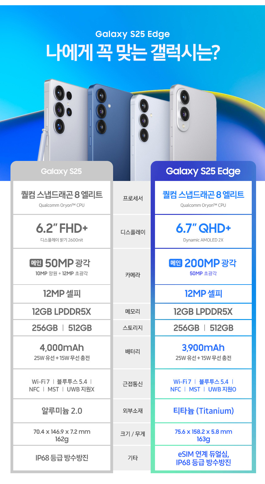 | 항목 | 갤럭시 S25 | 갤럭시 S25 엣지 |