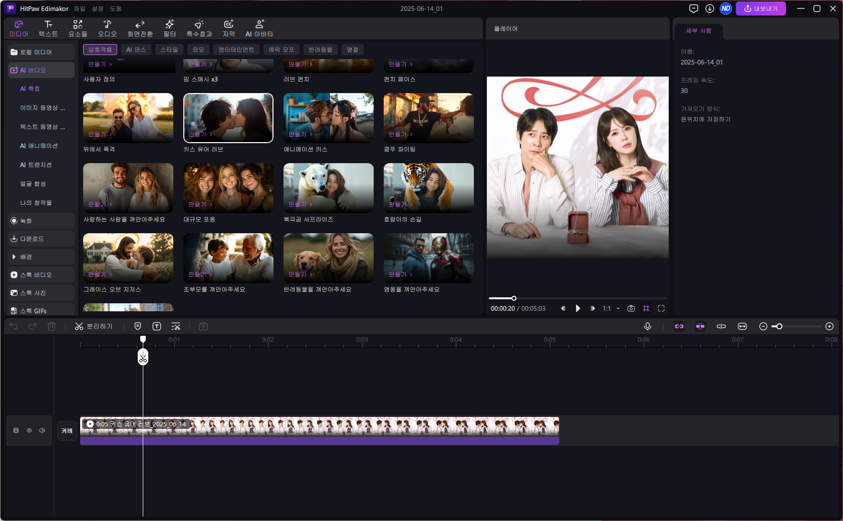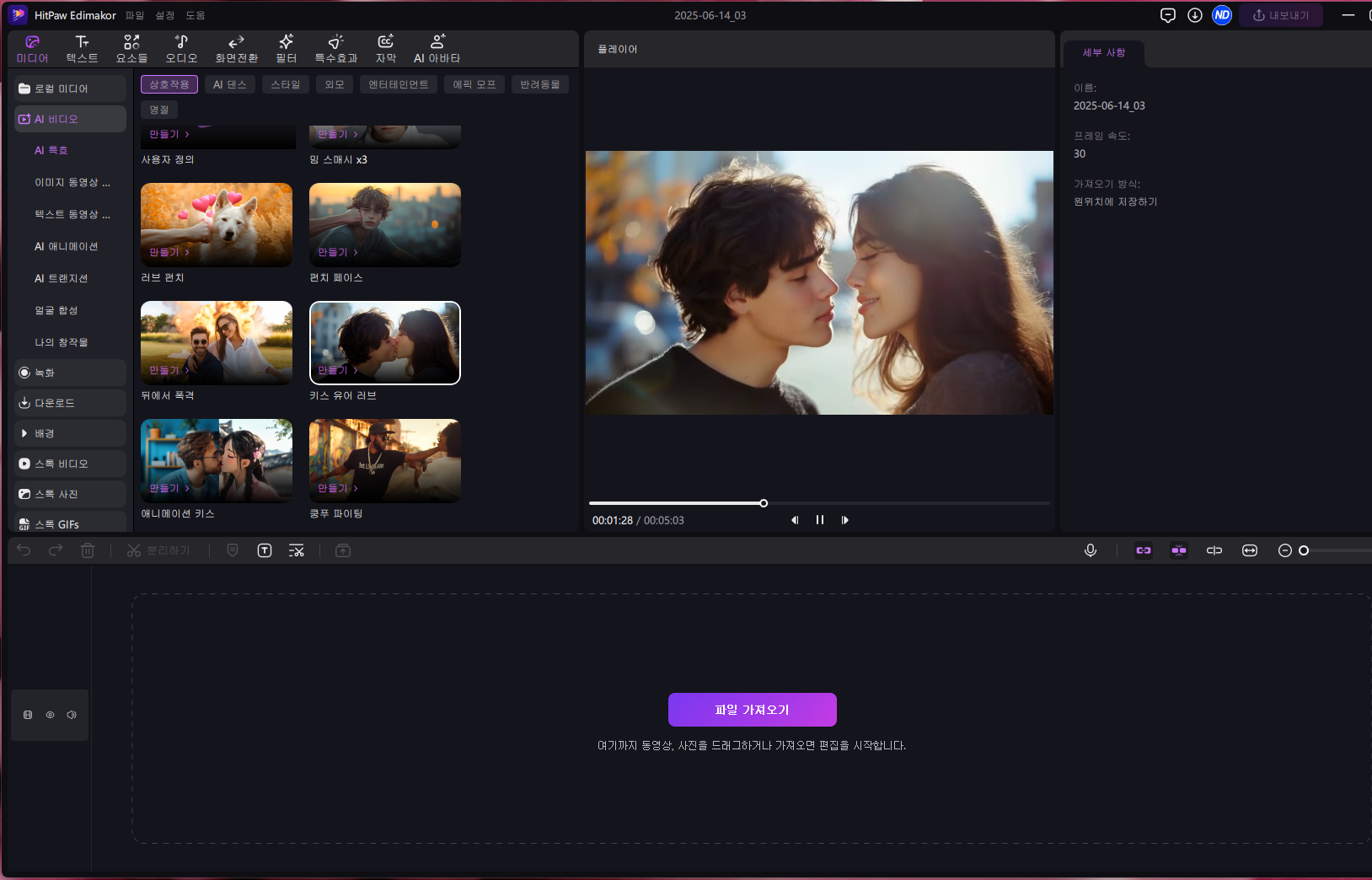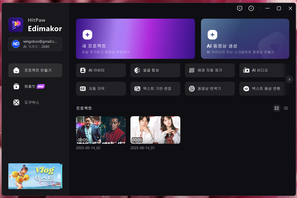 Edimakor는 AI를 적극적으로 활용한 강력한 동영상 편집 프로그램입니다. 일반적인 영상 편집 기능은 물론, AI 영상 제작을 위한 다양한 템플릿과 특수효과가 탑재되어 있습니다.