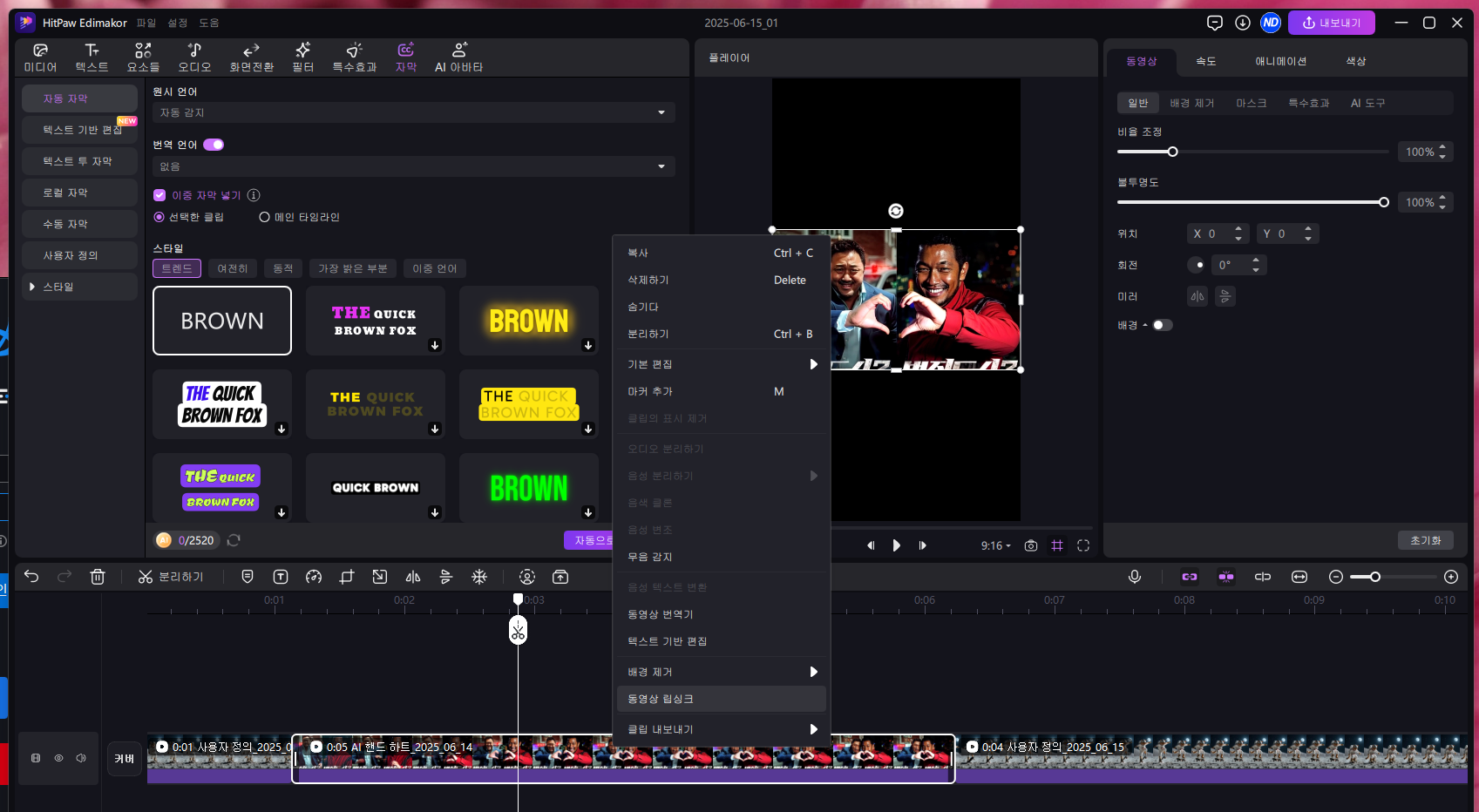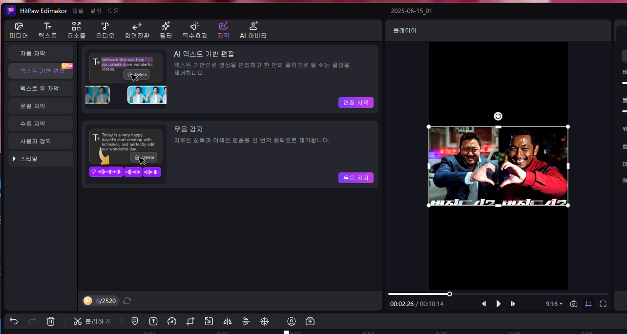 또 생성된 영상을 바로 Edimakor의 타임라인에 추가하여 추가 편집할 수 있습니다. AI 기반의 자막 추가 등도 뛰어나네요. AI 기능과 편집 기능을 한 프로그램 내에서 완벽히 결합해 영상 편집할 때, 편리성을 극대화해주네요.