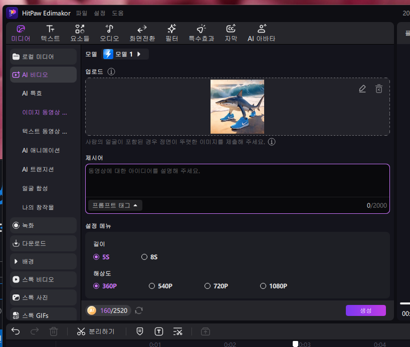 Edimakor의 가장 주목할 만한 기능 중 하나가 바로 이미지 동영상 변환 기능입니다. 이 기능은 사진 한 장만으로 짧고 임팩트 있는 동영상을 자동으로 생성합니다. 사용자는 단순히 사진을 업로드하고 간단한 프롬프트를 입력하는 것만으로 나만의 특별한 영상을 손쉽게 제작할 수 있습니다.
