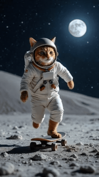 우주복을 입은 귀여운 고양이 우주비행사가 달 표면 위에서 스케이트보드를 타고 화려한 묘기를 펼칩니다. 배경으로 별빛이 반짝이고 지구가 아름답게 보이며, 고양이는 중력이 낮은 달 위에서 점프, 공중 회전, 백플립과 같은 놀라운 스케이트보드 트릭을 선보입니다. 장난기 있는 표정과 생동감 넘치는 움직임으로 시청자에게 웃음과 감탄을 자아내는 유쾌한 쇼츠 영상을 제작해주세요