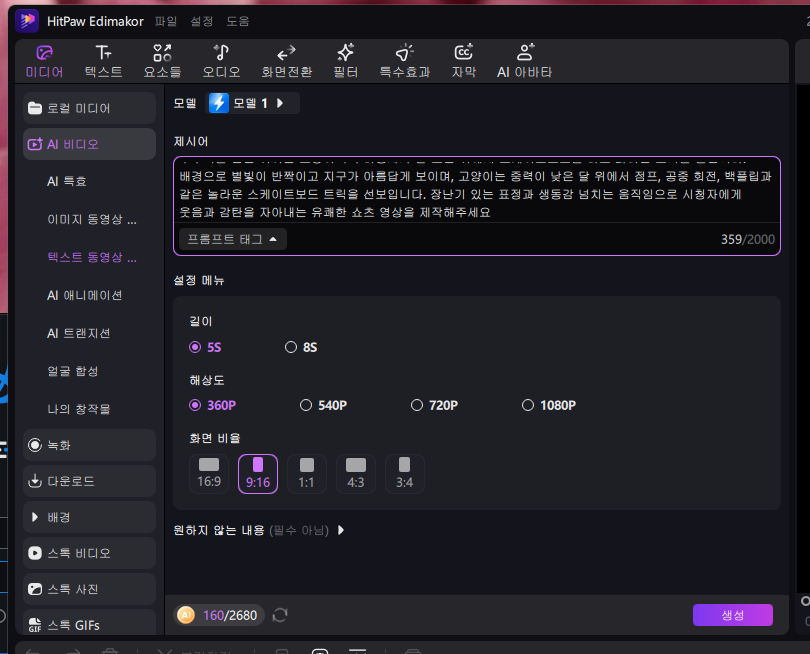 사진뿐만 아니라 텍스트 입력만으로도 원하는 영상을 손쉽게 생성할 수 있습니다. 예를 들어 간단한 스토리나 대사를 입력하면 AI가 자동으로 이를 바탕으로 영상을 만들어 줍니다.