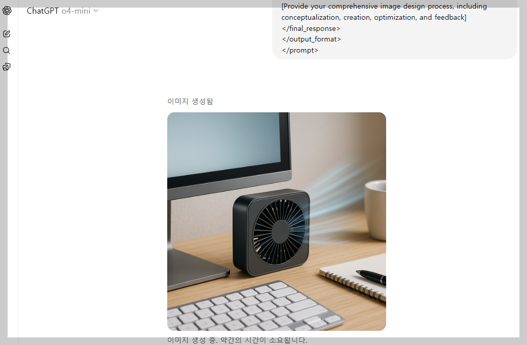 이미지 생성을 위한 명령어 프롬프트도 뽑아서 이미지 생성을 할 수 있었습니다. 이미지 생성에서는 제품의 실제 모습과 다를 수 있으니 주의해야 하는데요. 그래도 원하는 장면과 포인트를 잘 잡아 주었습니다.