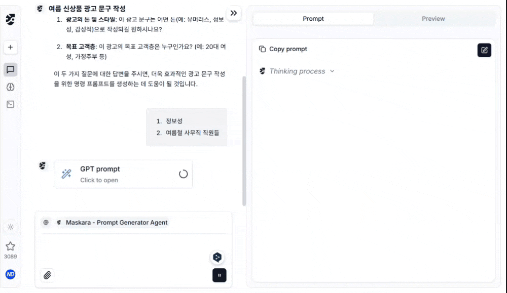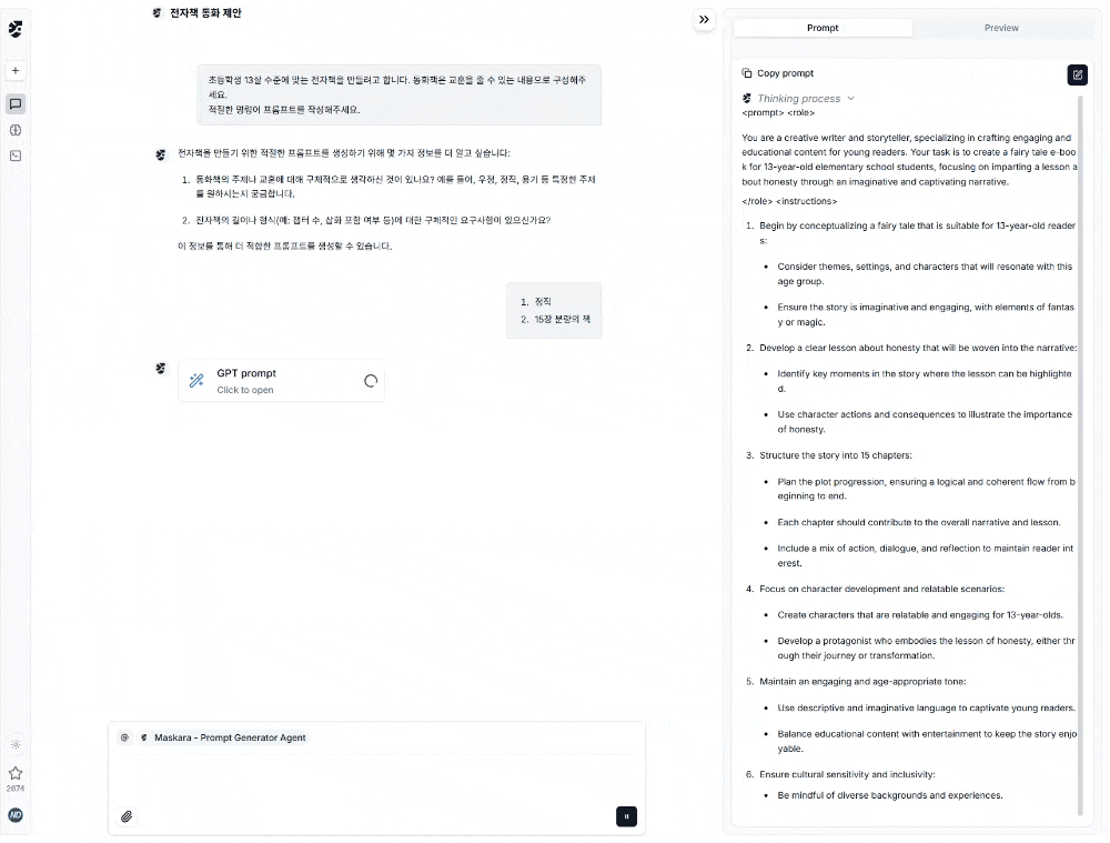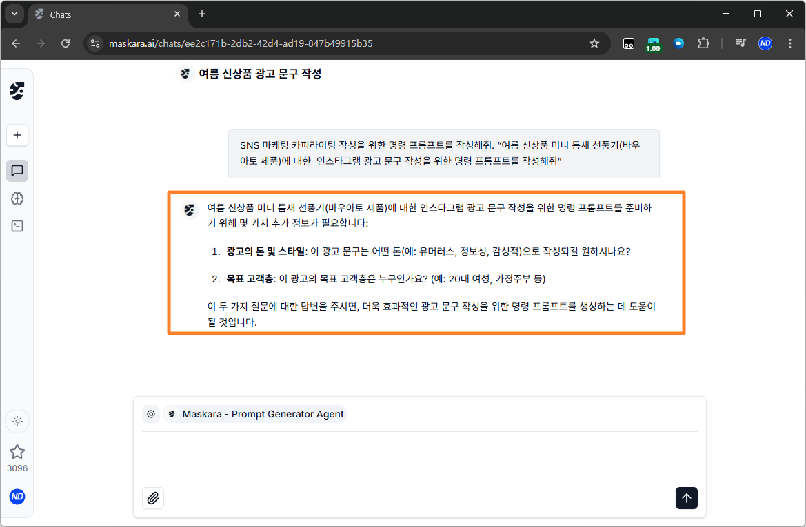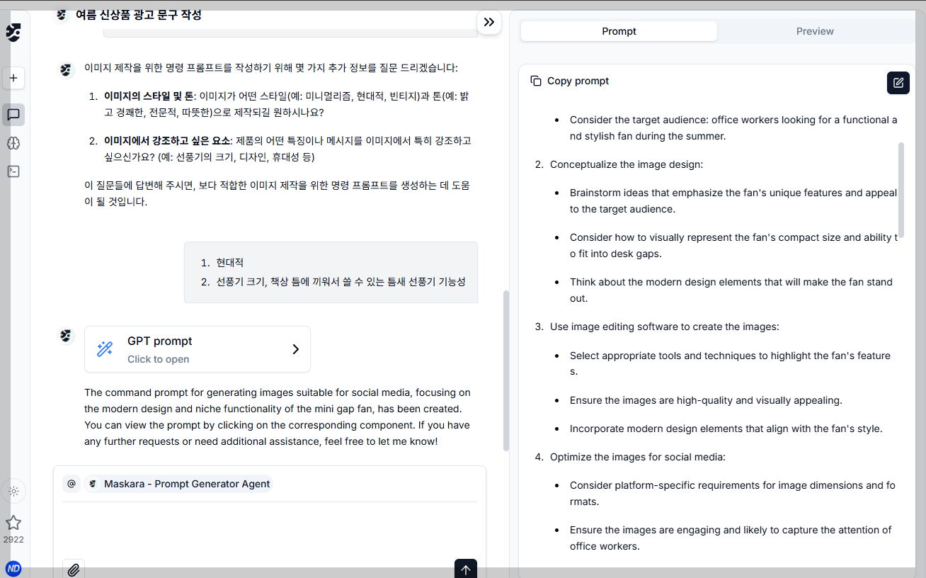 또 Maskara.ai 고유의 프롬프트 생성기 에이전트가 수천 개의 고품질 학습 데이터 기반으로 최적의 명령어 구조를 만들어 줍니다.