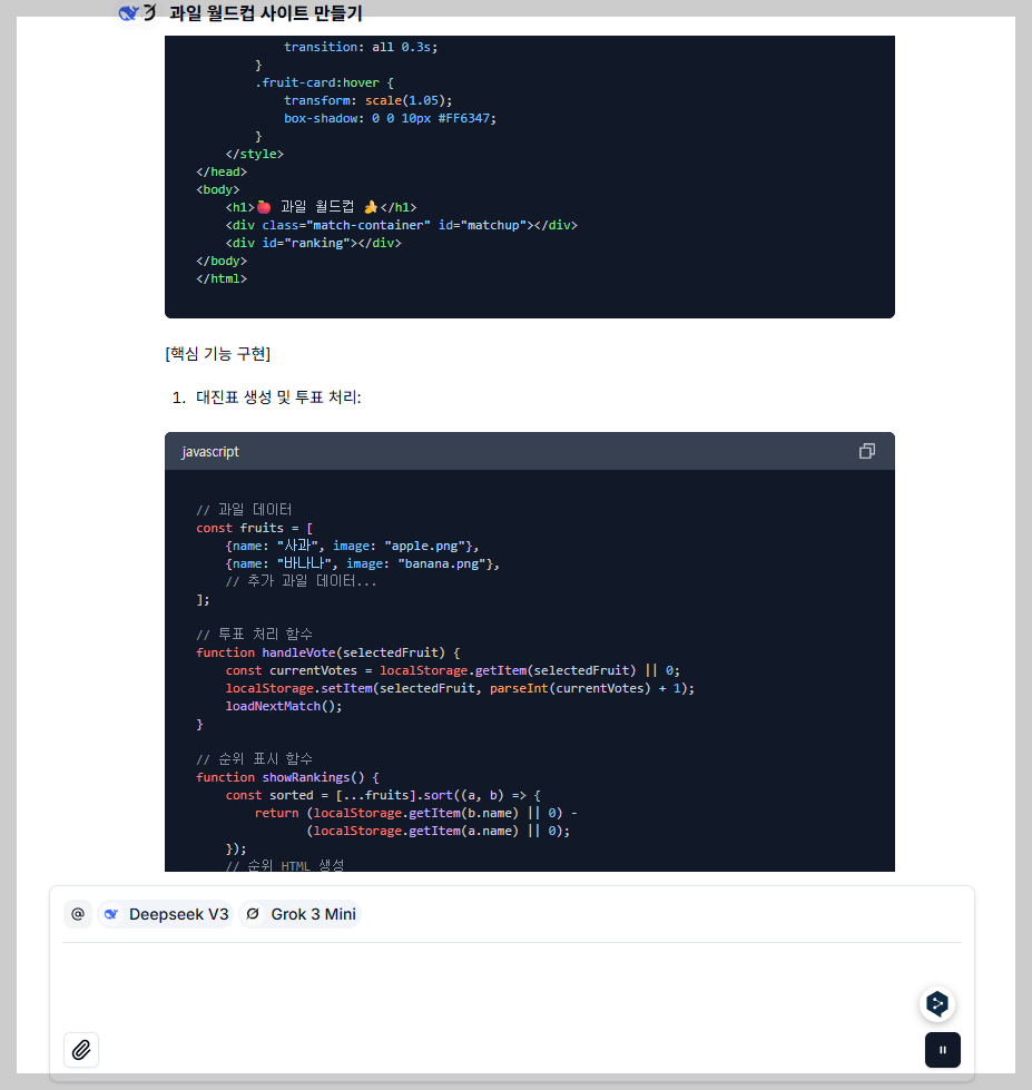구독하고 있지 않지만, 클로드 3.7 소나 싱킹과 딥시크 그록3, 라마4 등 다양한 AI 조합으로 원하는 결과를 손쉽게 얻을 수 있었습니다. 여러 AI를 모두 구독하기는 쉽지 않기 때문에 이렇게 월 10달러에 다양한 AI 모델 서비스로부터 도움을 받는 것은 상당히 유용했습니다.