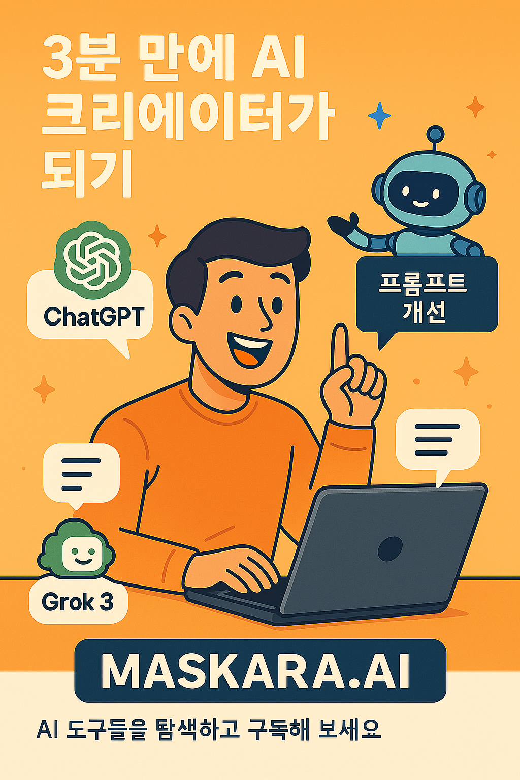 초보자도 3분이면 AI 크리에이터가 될 수 있습니다. 지금 가장 핫한 AI 도구로 Maskara.ai에서 첫 프로젝트를 시작해 보세요. 정말 챗GPT, 그록3(Grok 3), 클로드(Claude), 퍼플렉시티(perplexity) 등 많은 AI도구가 나의 좋은 조수가 될 수 있습니다.