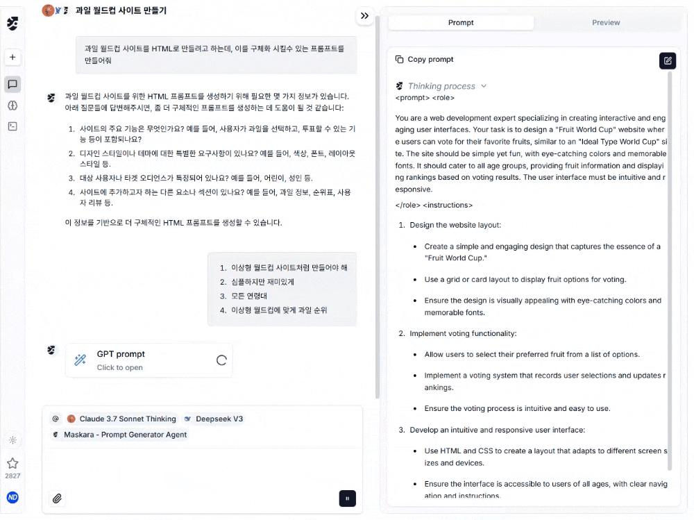 이제 어떻게 시켜야 할지 고민하지 말고 Maskara.ai 서비스로 프롬프트 개선 서비스를 받아 보시면 좋습니다. 필자도 다양한 AI 도구로 프로그래머로 개발 프로젝트를 하고 있습니다. 그리고 각종 회사 및 잡무를 AI 서비스를 이용해서 처리하고 있습니다.
