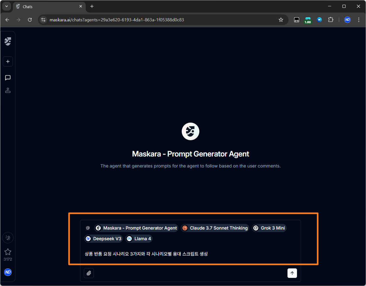 채팅창이 나오고 Maskara 프롬프트 에이전트와 그외 ai서비스들이 모두 나옵니다.
