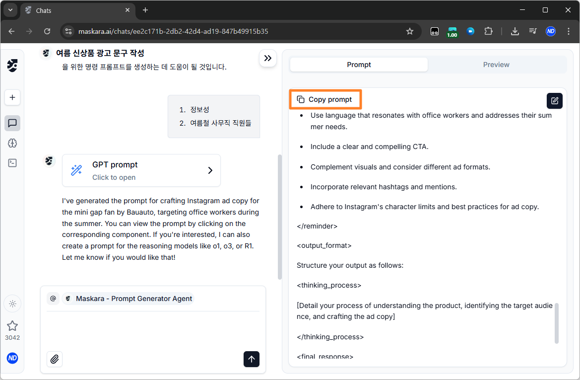 Maskara - Prompt Generator Agent 를 선택합니다.