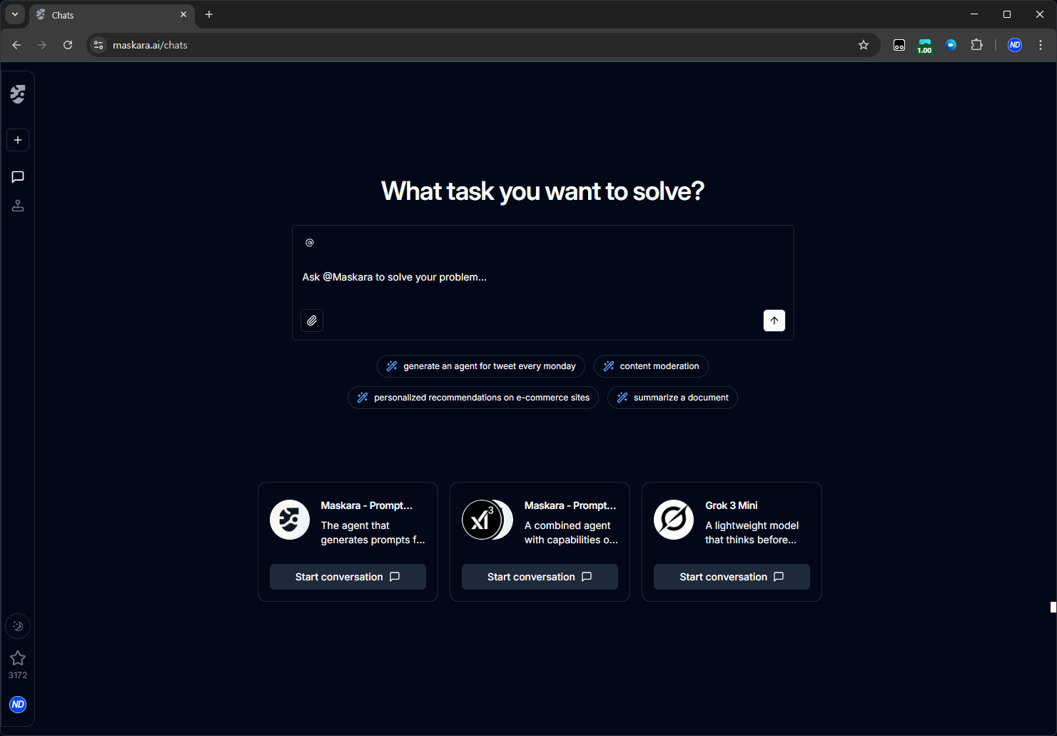 채팅창이 나오고 Maskara 프롬프트 에이전트와 그외 ai서비스들이 모두 나옵니다.