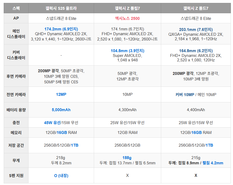 - 갤럭시 Z 폴드7: 7.6인치 폴더블 메인 디스플레이, 스냅드래곤 8 Gen 4 탑재, S펜 지원
