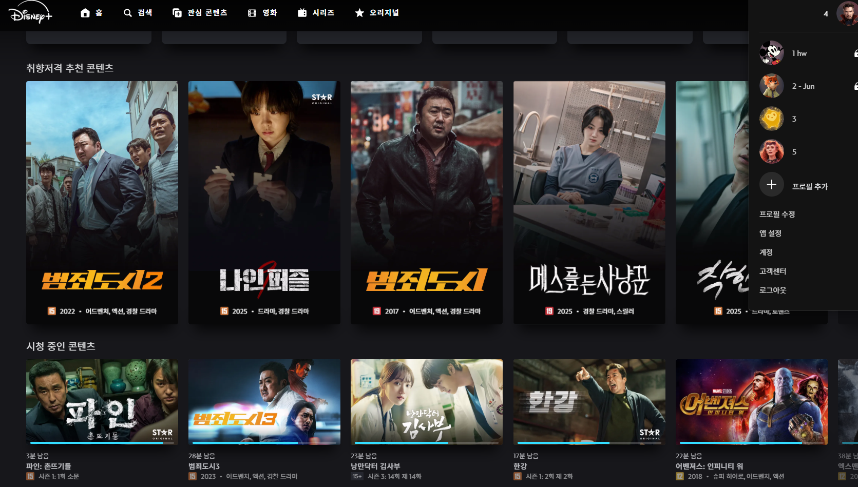 결재 후, 구독을 누르면, 디즈니플러스가 있습니다.