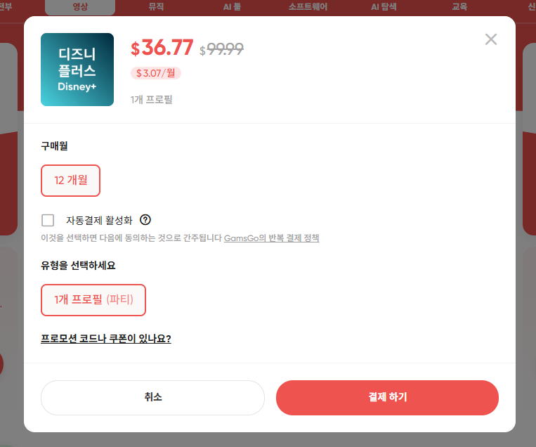 디즈니플러스 12개월 구독을 누르고 구매를 합니다.