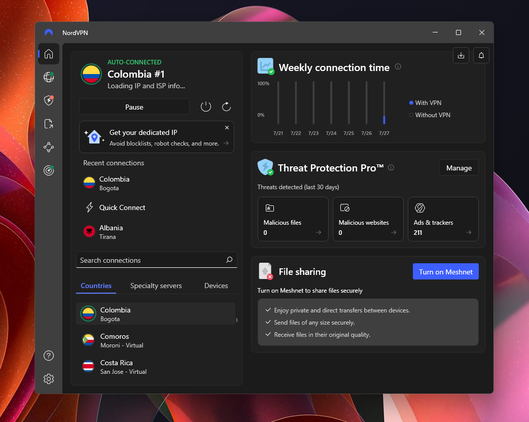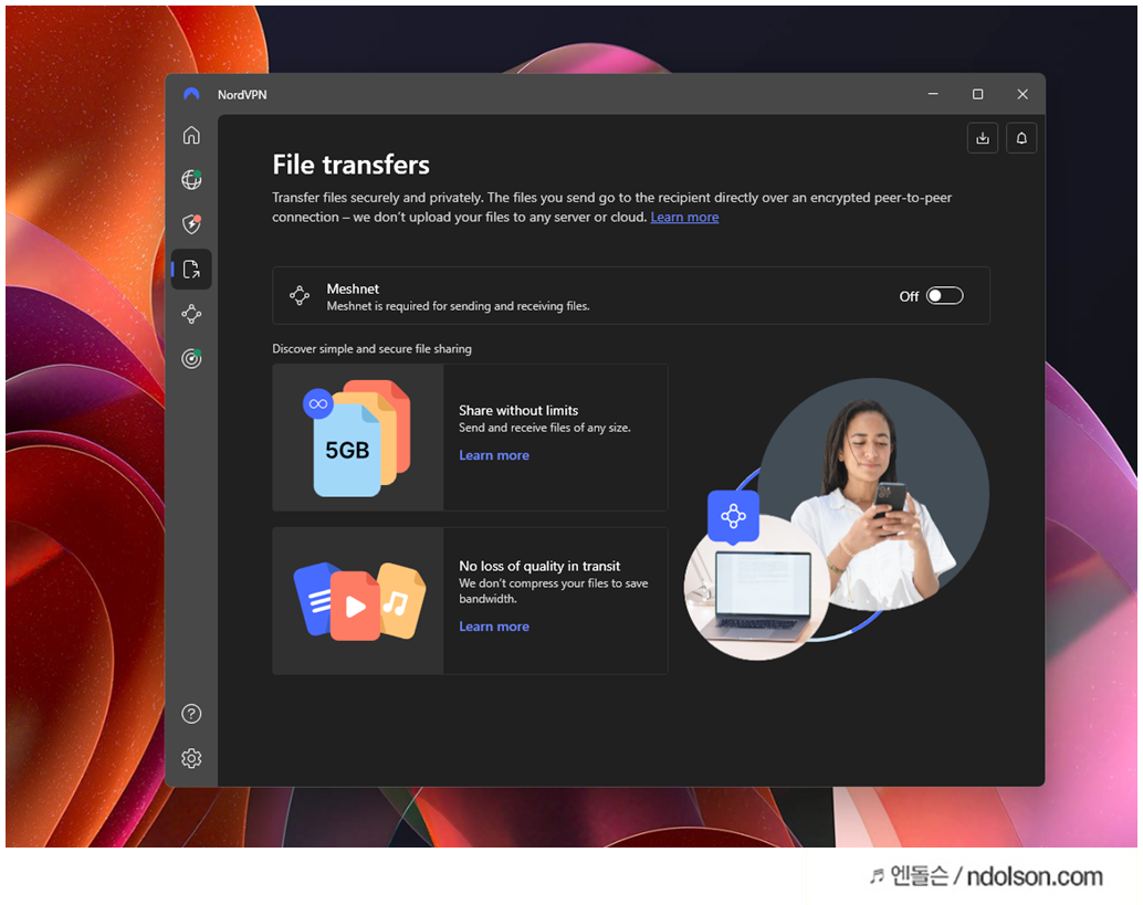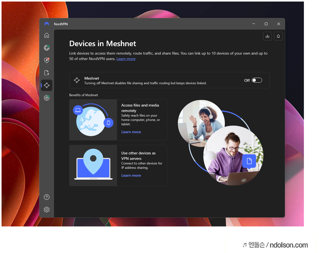Meshnet 기능 최근 도입된 혁신적 기능으로 VPN을 통해 개인 네트워크를 구축할 수 있습니다. 집에 있는 NAS나 컴퓨터에 원격으로 안전하게 접속하거나, 친구들과 암호화된 네트워크를 공유할 수 있습니다.