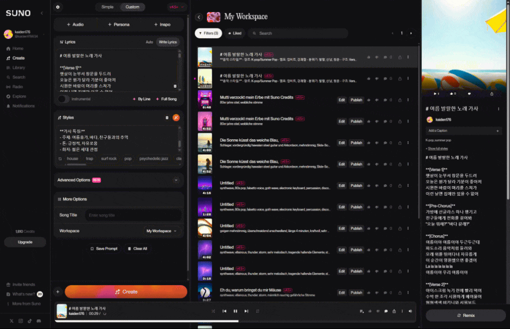 음질과 완성도: 생성되는 음악의 품질이 상상 이상으로 높았습니다. 특히 팝, 록, 일렉트로닉 장르에서는 상업적 활용이 충분히 가능한 수준의 결과물을 얻을 수 있었습니다.