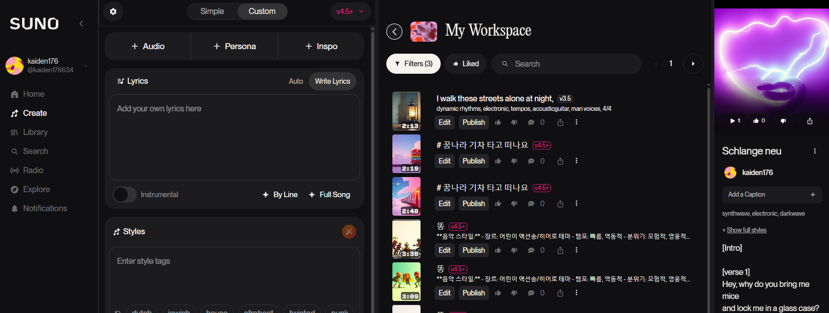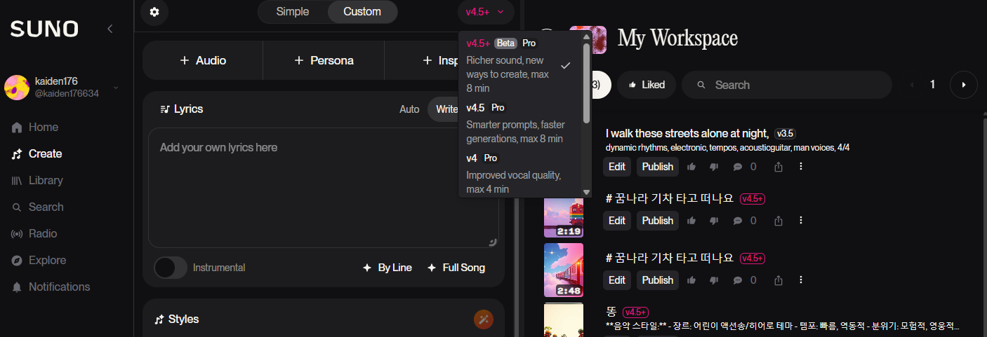 요금제에 따라 AI 모델도 달라집니다. SUNO v4.5+ Pro를 사용하여 한국어도 더 잘되는 음악 작곡을 할 수 있습니다.
