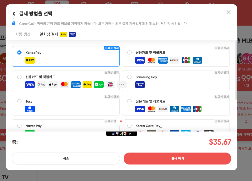 카카오페이, 네이버페이, 토스, 신용카드 등으로 결재가 가능합니다.