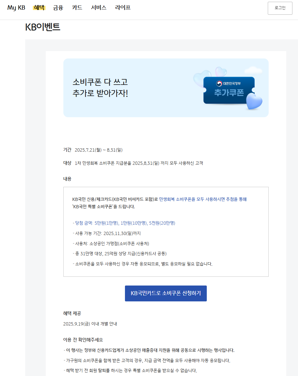 - 추가 소비쿠폰: 기본 소비쿠폰 외에 추가로 'KB국민 특별 소비쿠폰'을 받을 수 있습니다.