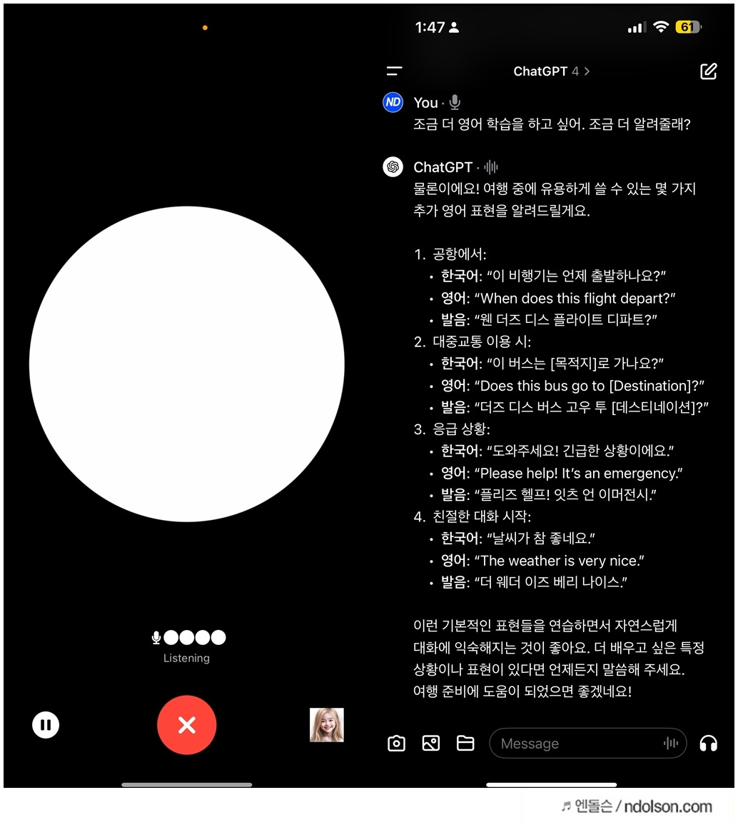 단순한 음성 인식을 넘어서 진정한 대화형 AI 경험을 제공합니다. 대화해보면 상당히 재미있습니다. 특히 영어 발음 교정이나 카메라를 켜서 모르는 물건에 대한 정보도 쉽게 얻을 수 있습니다.