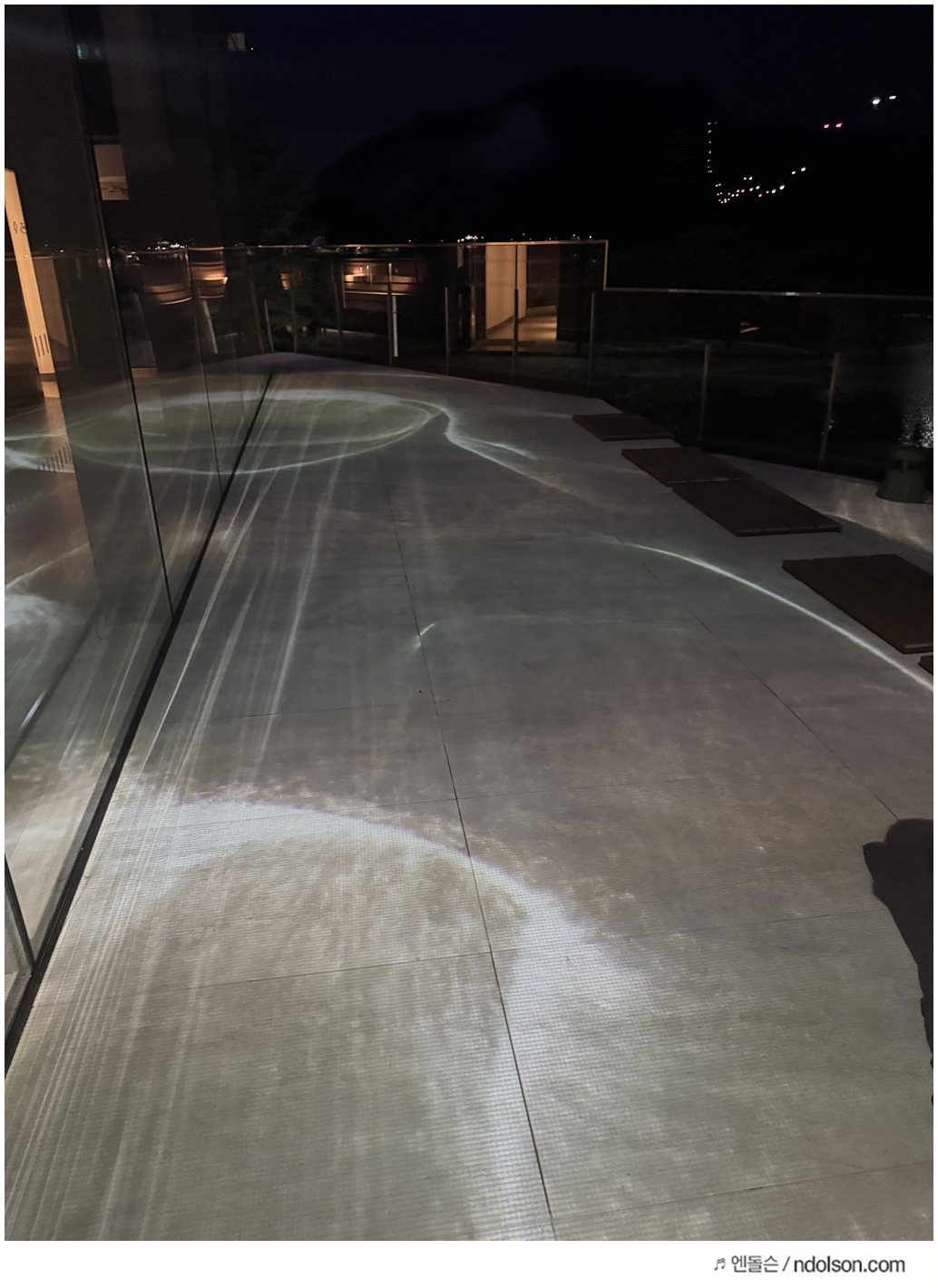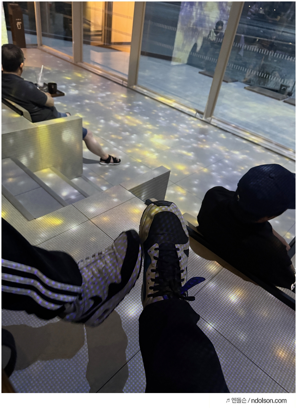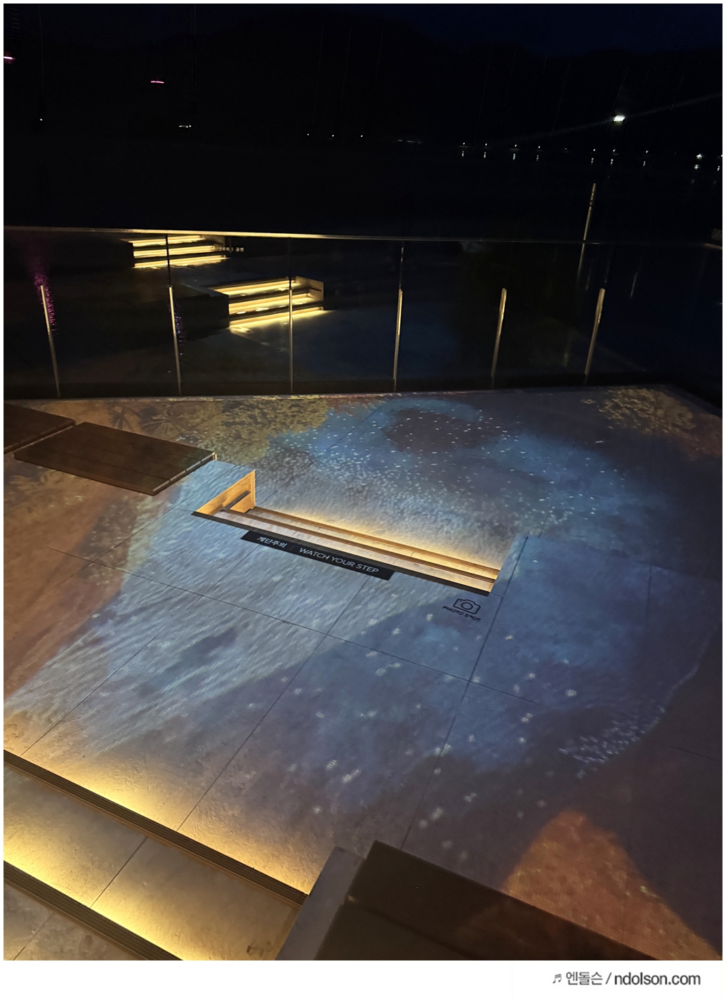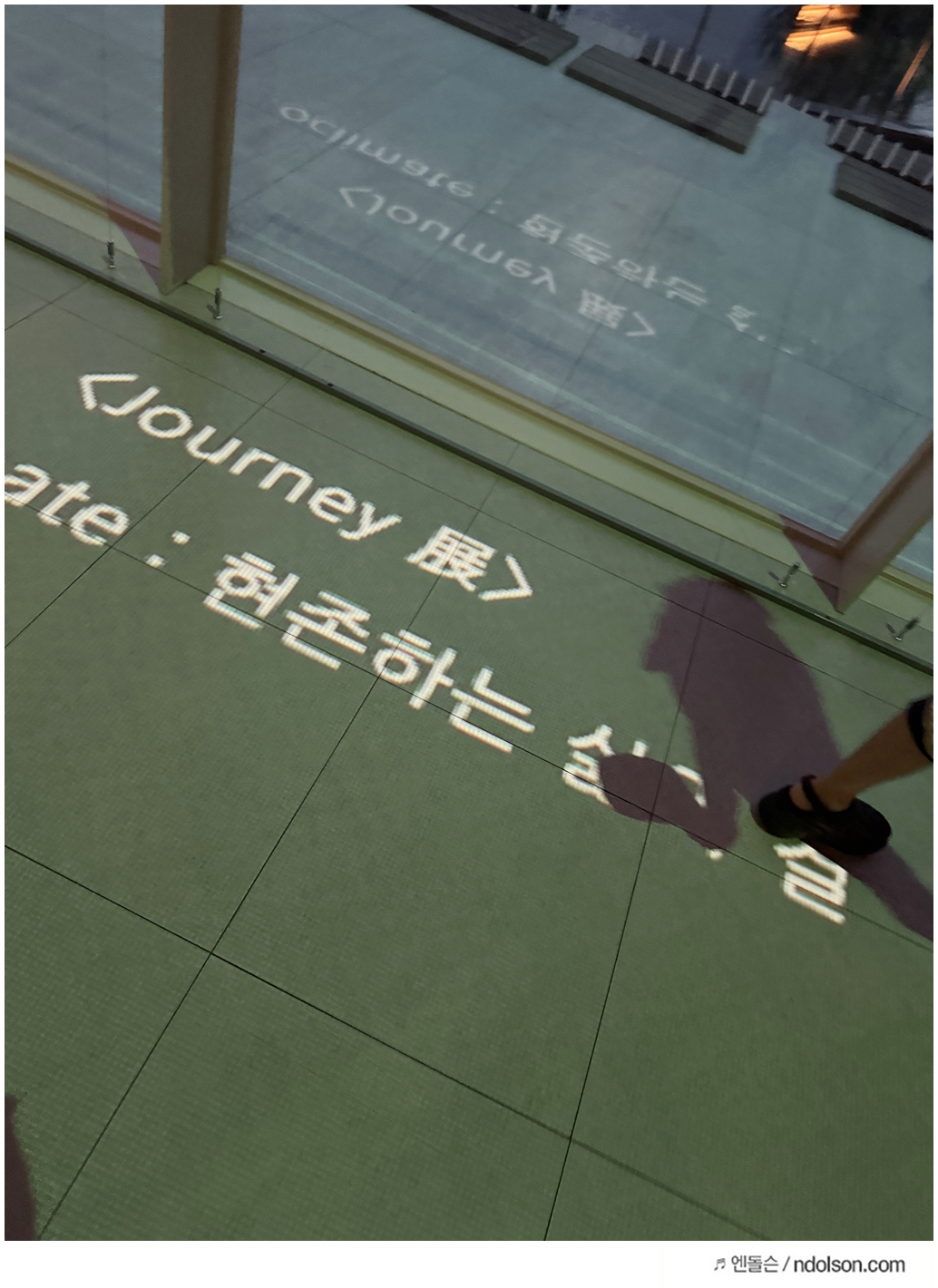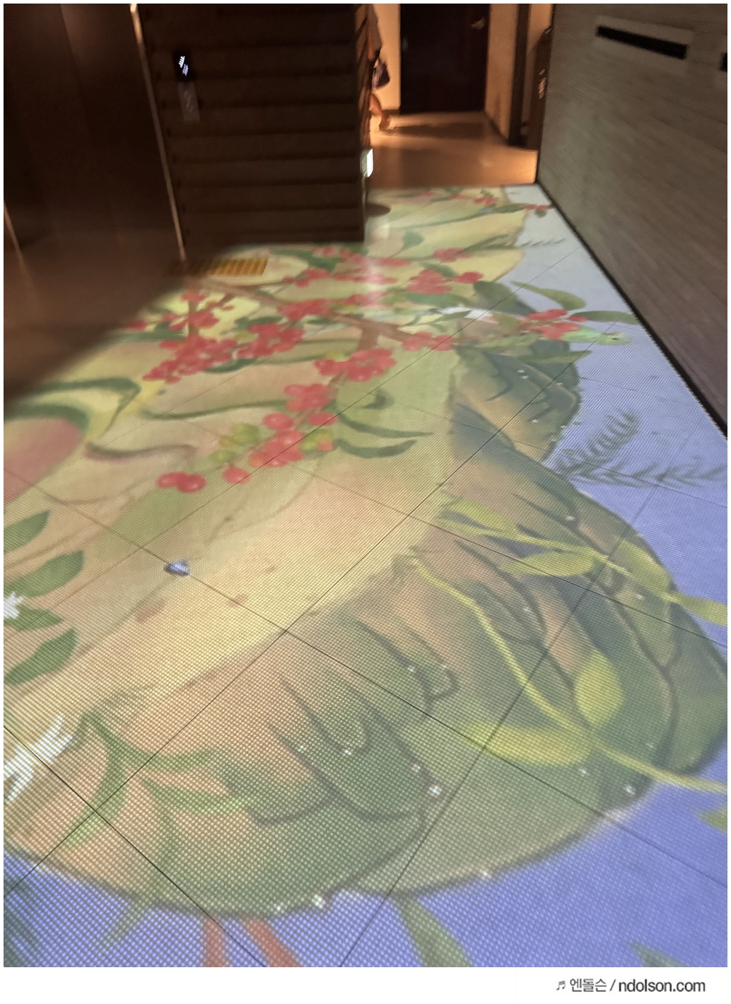 미디어 아트 진행 중에는 바닥에 투사된 영상 때문에 이동할 때 주의가 필요했습니다. 특히 딸아이처럼 아이들이 바닥의 영상을 따라 뛰어다니는 경우가 많아서, 음료를 들고 이동할 때는 각별한 주의가 필요했습니다. 딸아이에게도 미리 "조심해서 걸어야 해"라고 당부했어요.