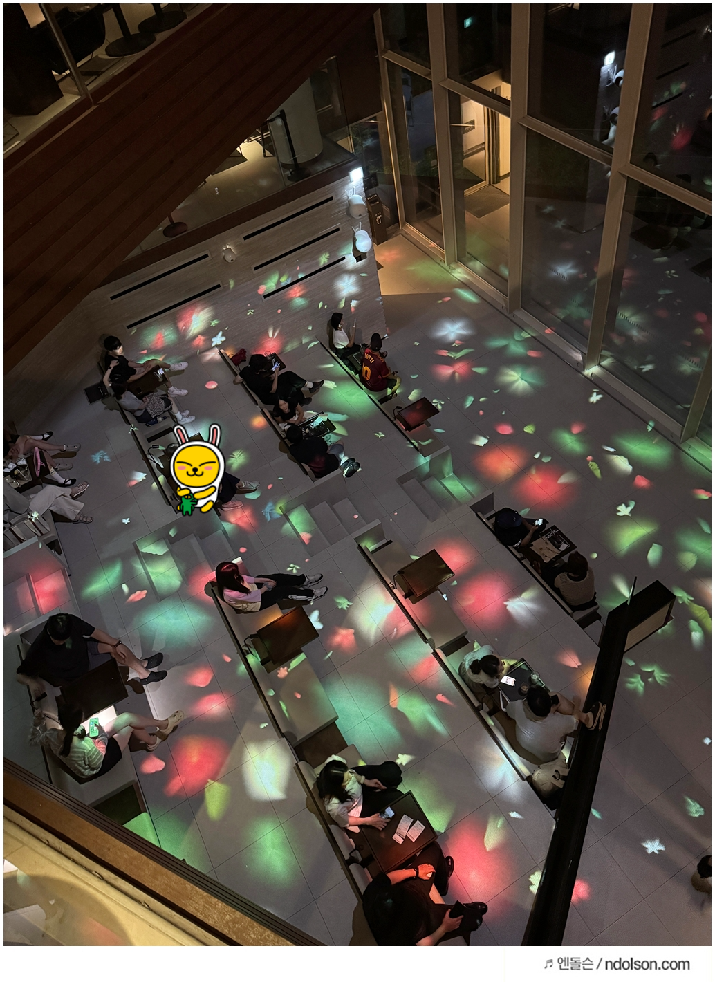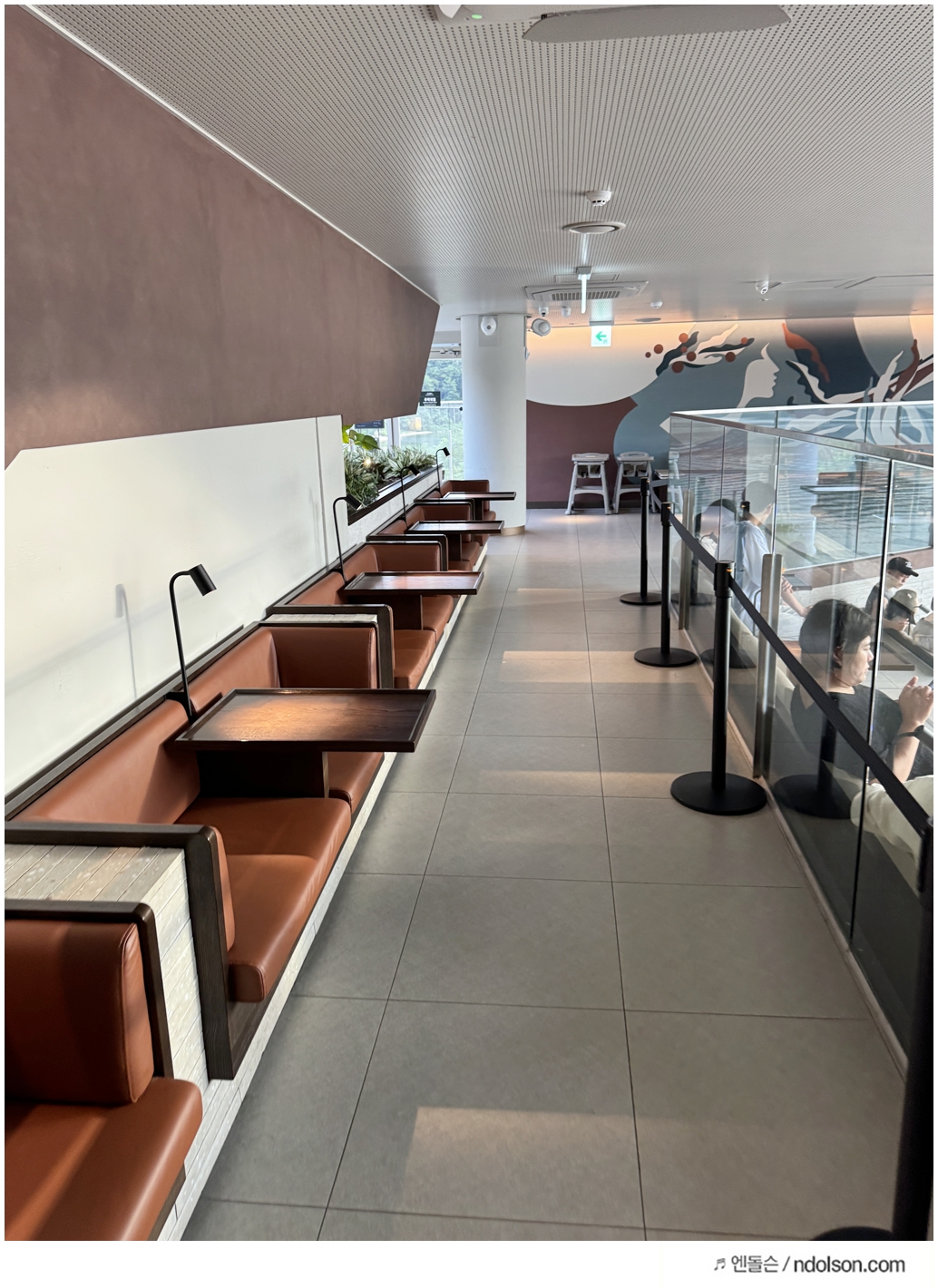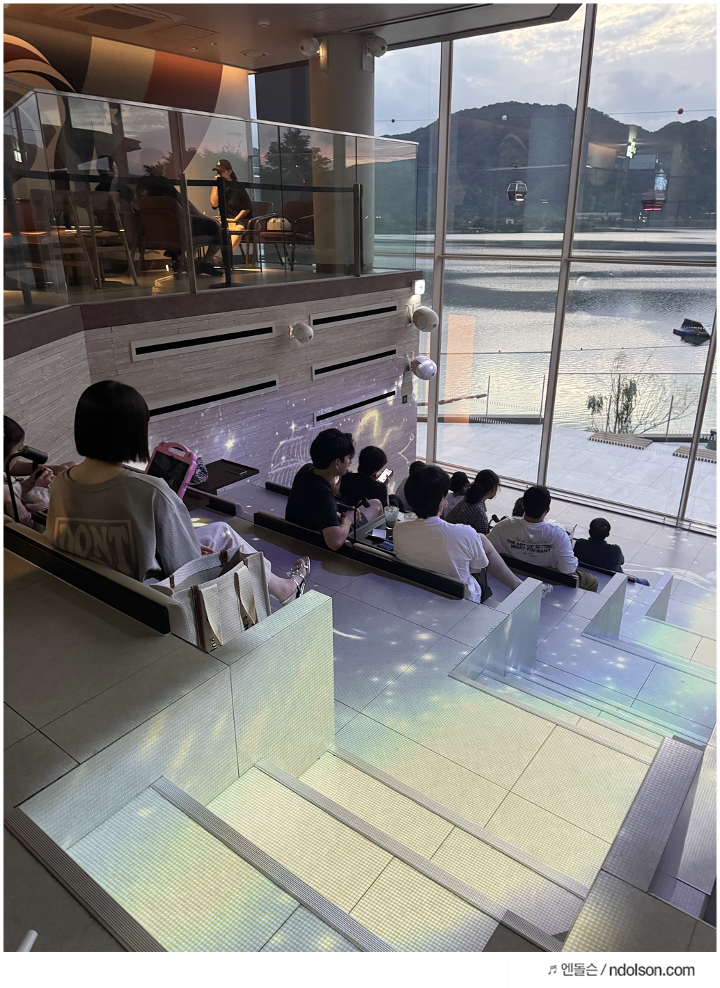 여름 휴가철이라 그런지 가족 단위 방문객이 많아서 좌석 경쟁이 꽤 치열했습니다. 특히 2-3층의 인기 자리는 금세 차버리더군요. 하지만 좌석 회전이 생각보다 빠른 편이라 조금만 기다리면 자리를 잡을 수 있었습니다. 계단 옆이 좋지만, 와이프말로는 다른 사람들이 찍으면 우리 얼굴 다 나온다고 위에서 찍었습니다. 계단 옆자리가 명당인데요. 계단 바라보고 왼쪽 2~3열이 좋습니다. 위에서 찍으면 정면, 중앙입니다. 찍고 빠지면 되죠. 나중에 자리는 평일이라서 났습니다.