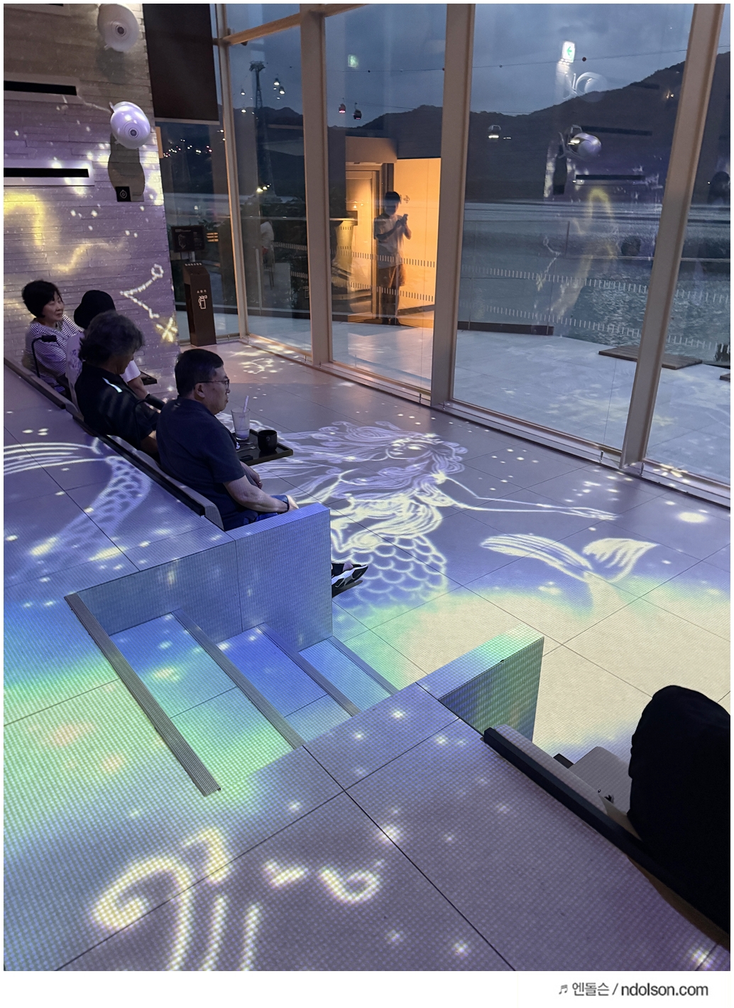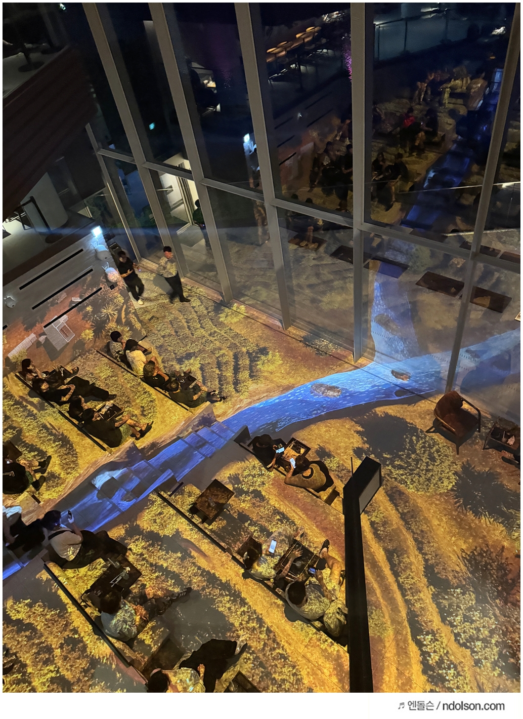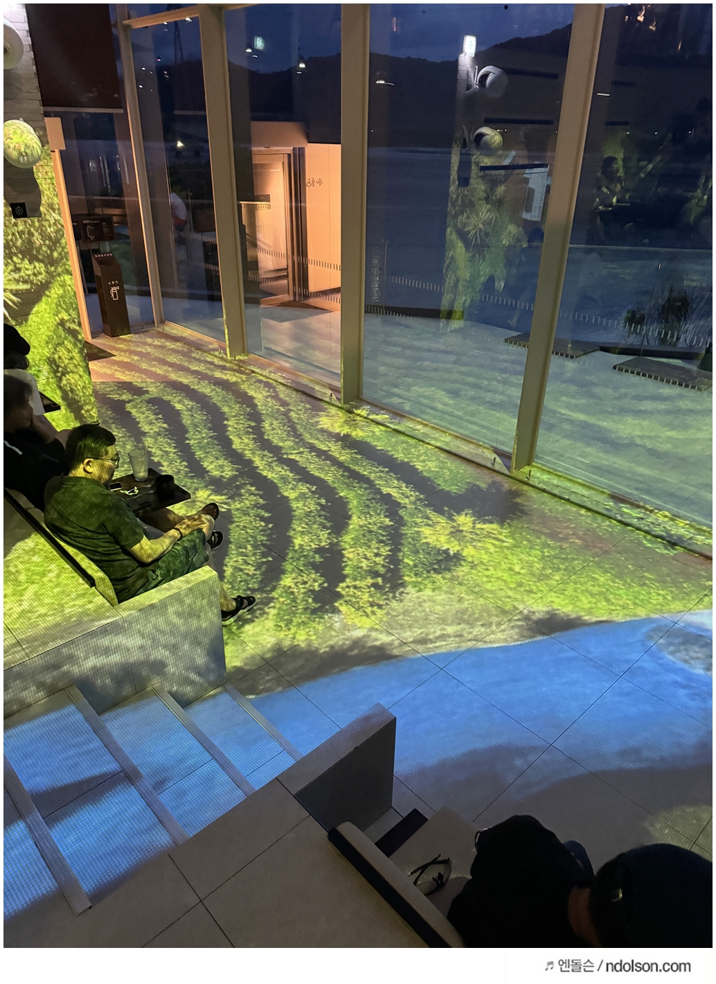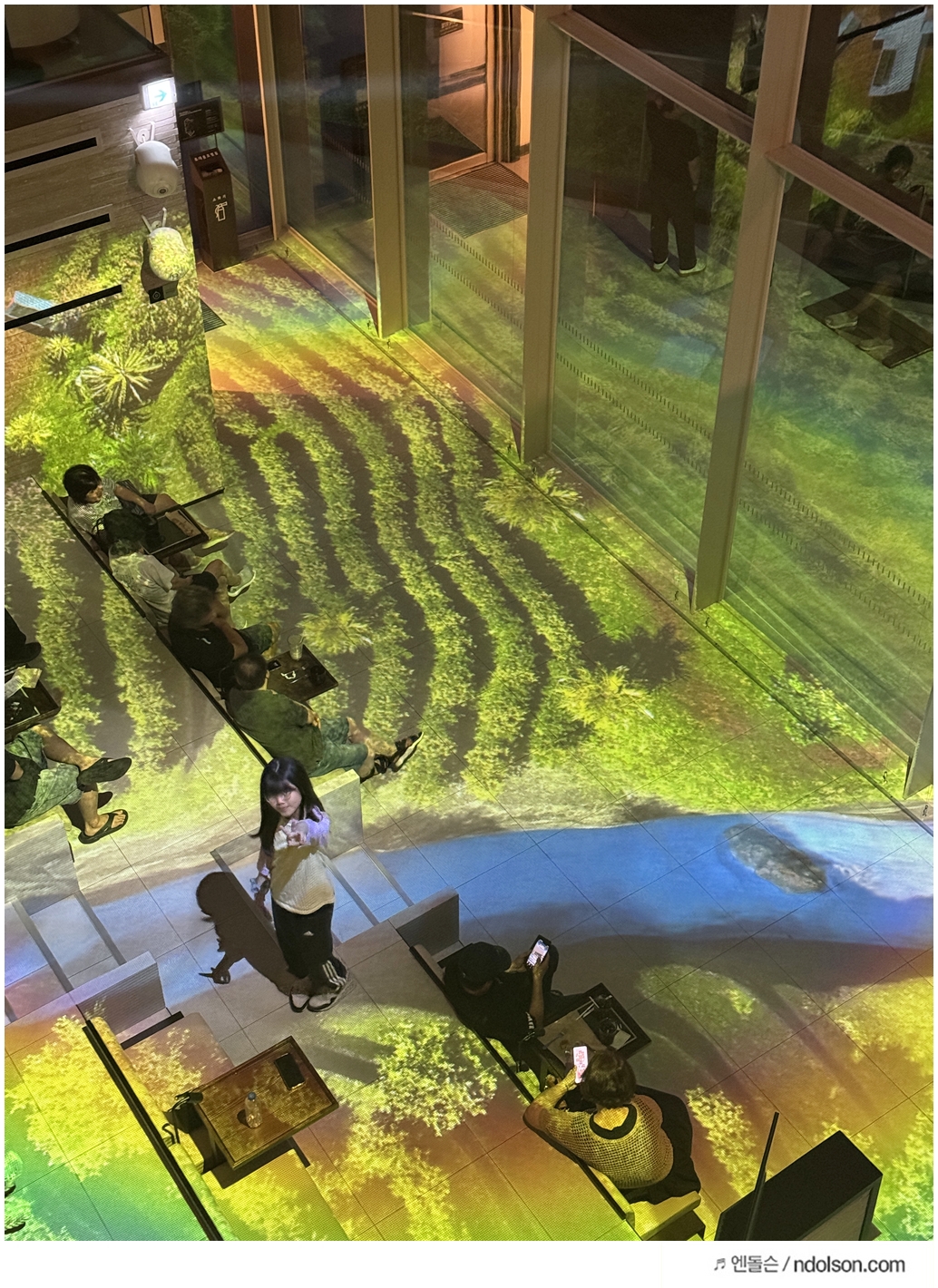 여름이라 해가 길어서 오후 6시에도 아직 밝았는데, 7시가 넘어서야 미디어 아트의 진가를 제대로 느낄 수 있었습니다. 블라인드를 내려도 낮 시간에는 영상이 흐릿하게 보여 몰입감이 떨어질 수 있기 때문입니다. 저녁 노을이 지고 나서야 비로소 작품의 아름다움을 완전히 경험할 수 있었어요.