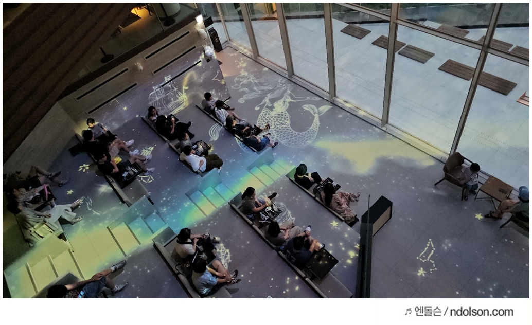 30분간 진행된 미디어 아트를 관람하면서 가장 좋았던 자리는 2층이었습니다. 바닥과 벽면에 동시에 투사되는 영상을 한눈에 볼 수 있어 작품의 전체적인 구성을 파악하기에 최적이었습니다. 딸아이도 2층에서 아래를 내려다보며 바닥의 영상 변화를 관찰하는 것을 재미있어했어요.