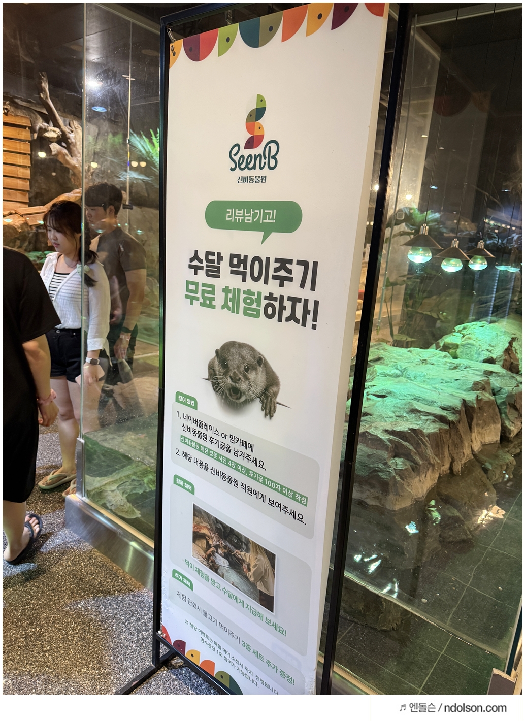 네이버에 후기 남기면 먹이키트를 무료로 주는 이벤트가 종종 있다고 하니 방문 후에 꼭 후기 남겨보세요! 저도 이번에 후기 남기고 먹이키트 받았어요. 수달 먹이 받았어요. 100자 이상 적어야 해요 ㅠㅠㅠㅠㅠ