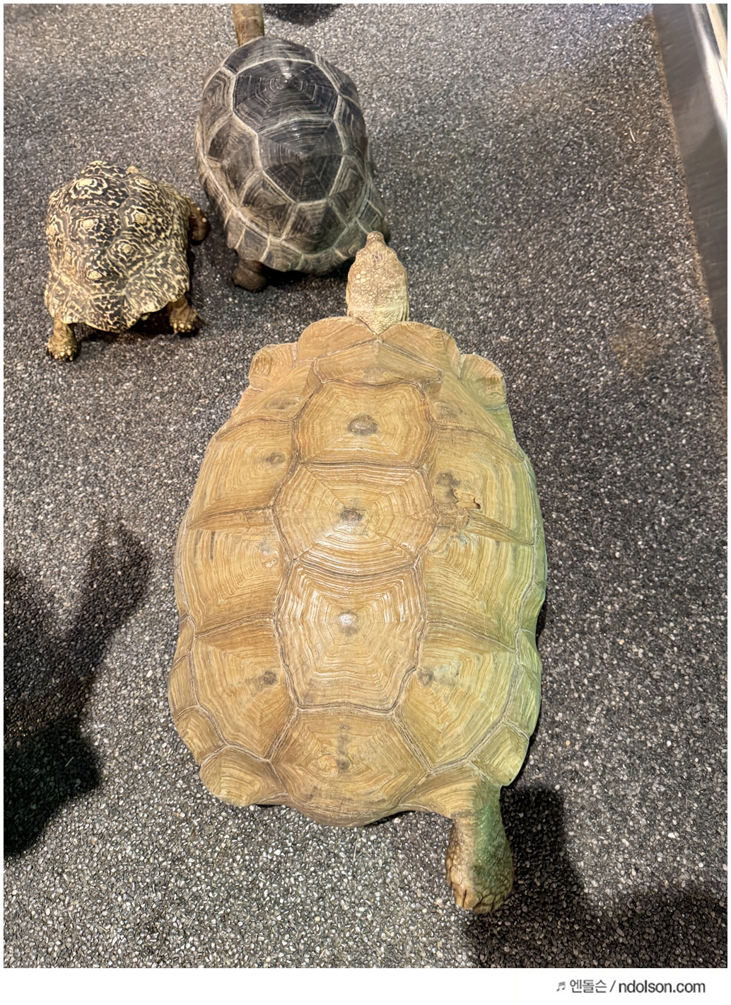 이 동물원의 가장 특별한 점 중 하나가 바로 거북이와 카피바라가 관람객들 사이를 자유롭게 돌아다닌다는 거예요. 처음엔 정말 놀랐어요. "어? 저기 거북이가 그냥 돌아다니네?" 했는데, 직원분이 만져도 된다고 하시더라고요.