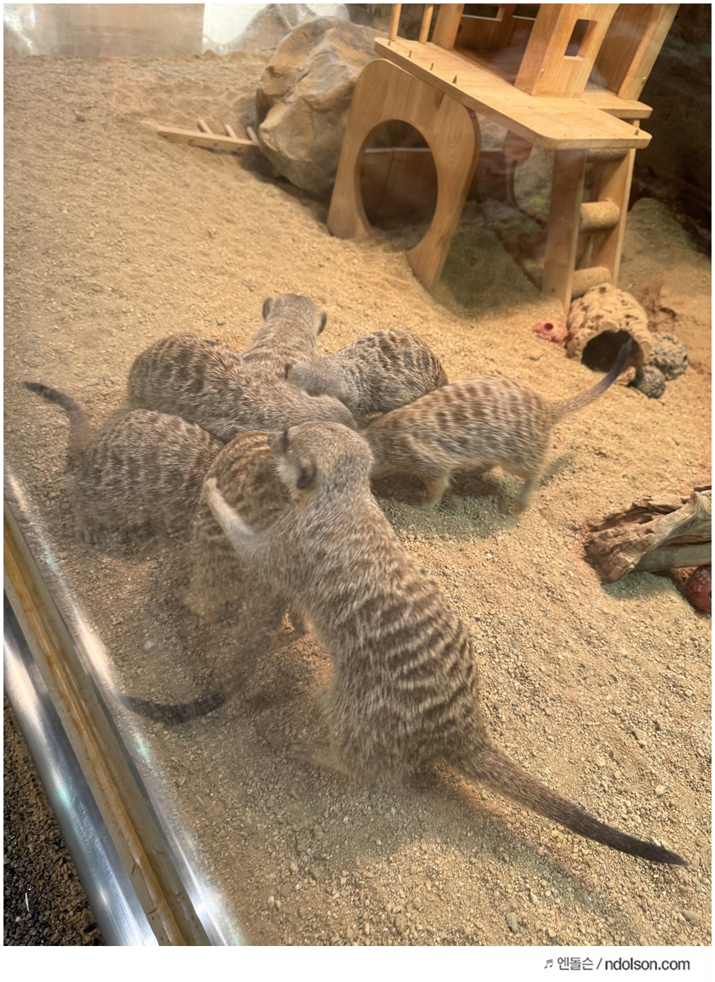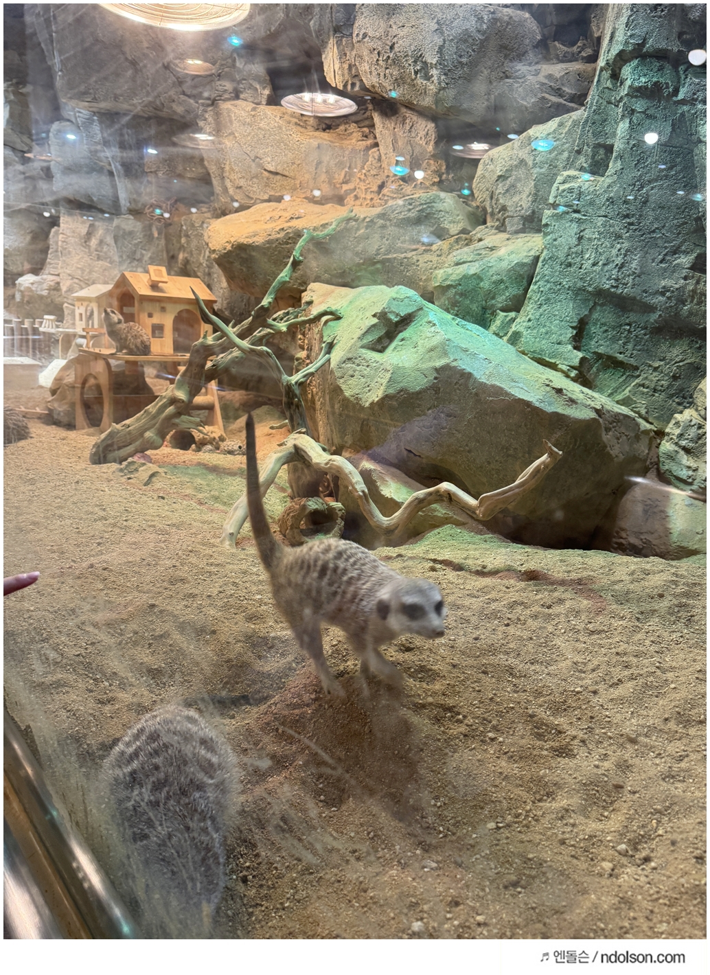 수달과 거북이, 카피바라 외에도 정말 다양한 동물들이 있었어요. 라쿤, 카멜레온, 미어캣, 육지거북, 잉어 등 평소에 보기 힘든 동물들을 직접 볼 수 있었거든요. 특히 미어캣들이 서서 주변을 경계하는 모습이 정말 귀여웠어요.